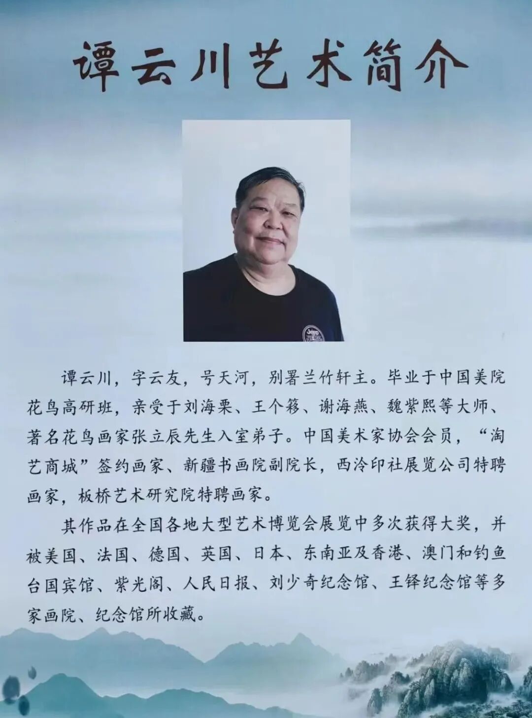 谭云川 字云友,号天河,别署兰竹轩主。毕业于中国美院花鸟高研班,亲受于刘海栗、王个够、谢海燕、魏紫熙等大师、著名花鸟画家张立辰先生入室弟子。中国美术家协会会员,“淘艺商城”签约画家、新疆书画院副院长,西泠印社展览公司特聘画家,板桥艺术研究院特聘画家。