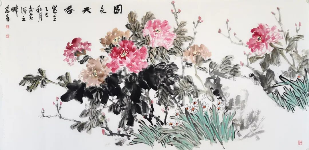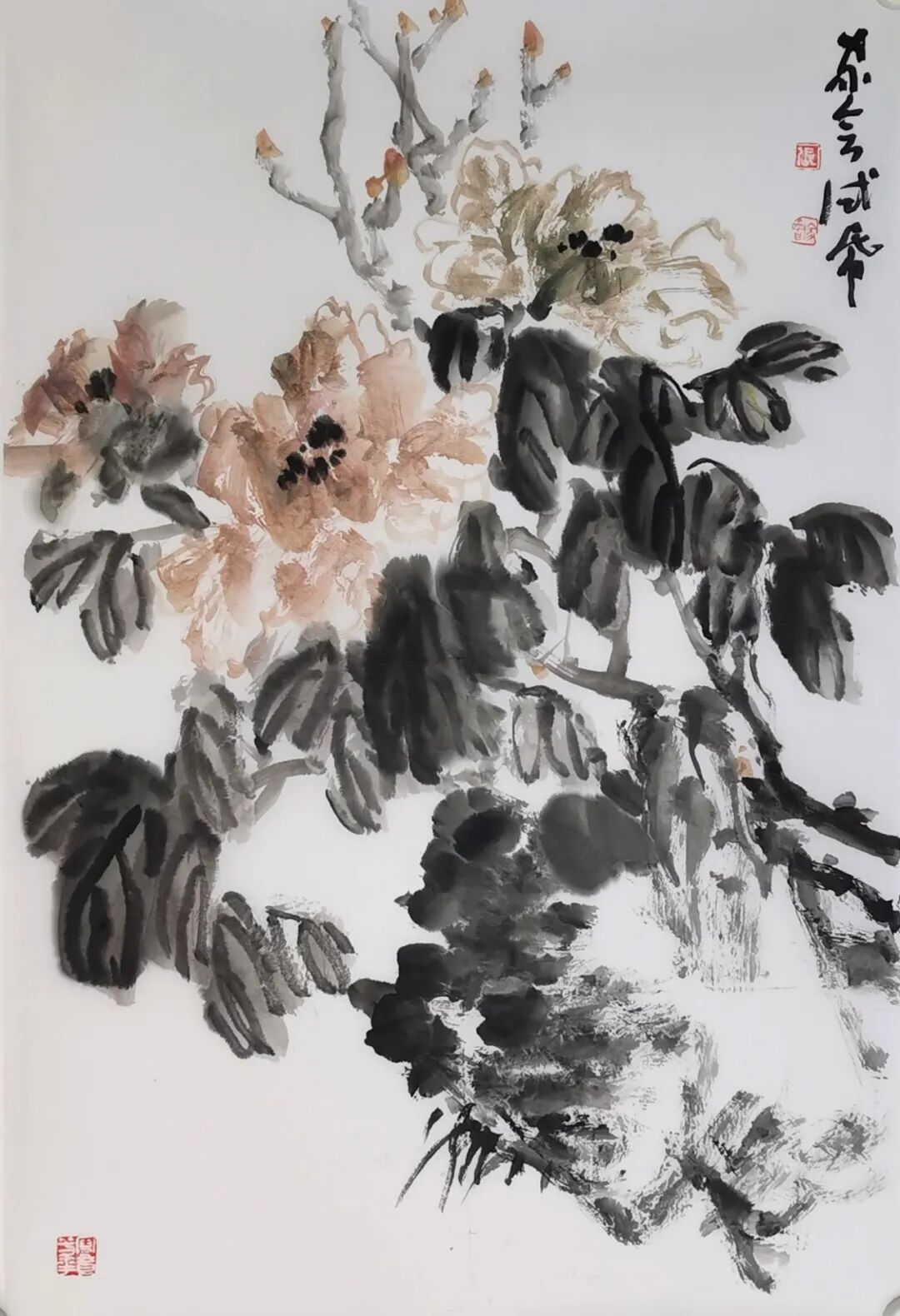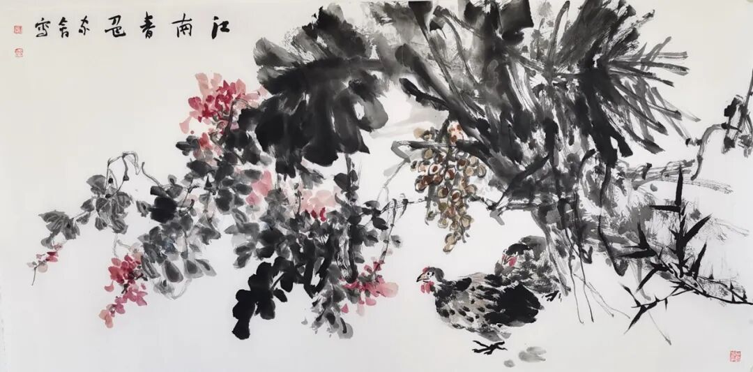 正是这种笔墨形态与意象符号的生成转化,使家会先生写意花鸟画有了丰富的表现力、概括力和寓意性。其“笔墨”形态是刚柔相济,跌宕多姿,气势中有节奏,浓淡里见色泽。正是通过运笔着墨与勾擦染点的意象表现,使其作品得到一种自然而然的审美意蕴交融。