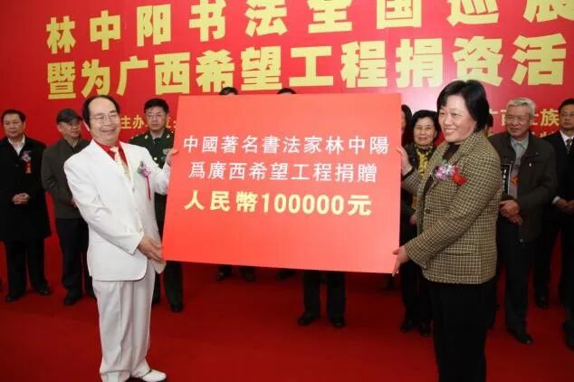 “穷则独善其身,达则兼济天下。”林中阳在艺术成就斐然之时,始终不忘回馈社会。他长期热心社会公益事业,用自己的所学回报社会、回报人民 。自2002年起,他每到一处举办书法展览,都会捐出10万元捐助一所希望小学 。迄今为止,在全国各地,已经有24所“林中阳希望小学”拔地而起,为无数贫困孩子提供了接受教育的机会 。他还为中国扶贫基金会、中华红十字会、中央电视台关注环保现场拍卖节目捐赠巨幅作品 ,在河北捐建了林中阳希望大道,在湖南捐建了林中阳书法碑林 。自2018年以来,他在21所中小学捐建书法工作室 ,致力于书法艺术的传承与推广。他以实际行动诠释了一位艺术家的社会责任与担当,展现了高尚的品德和无私的奉献精神,成为人们心目中德艺双馨的艺术家。