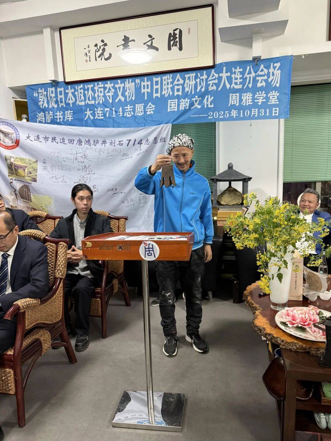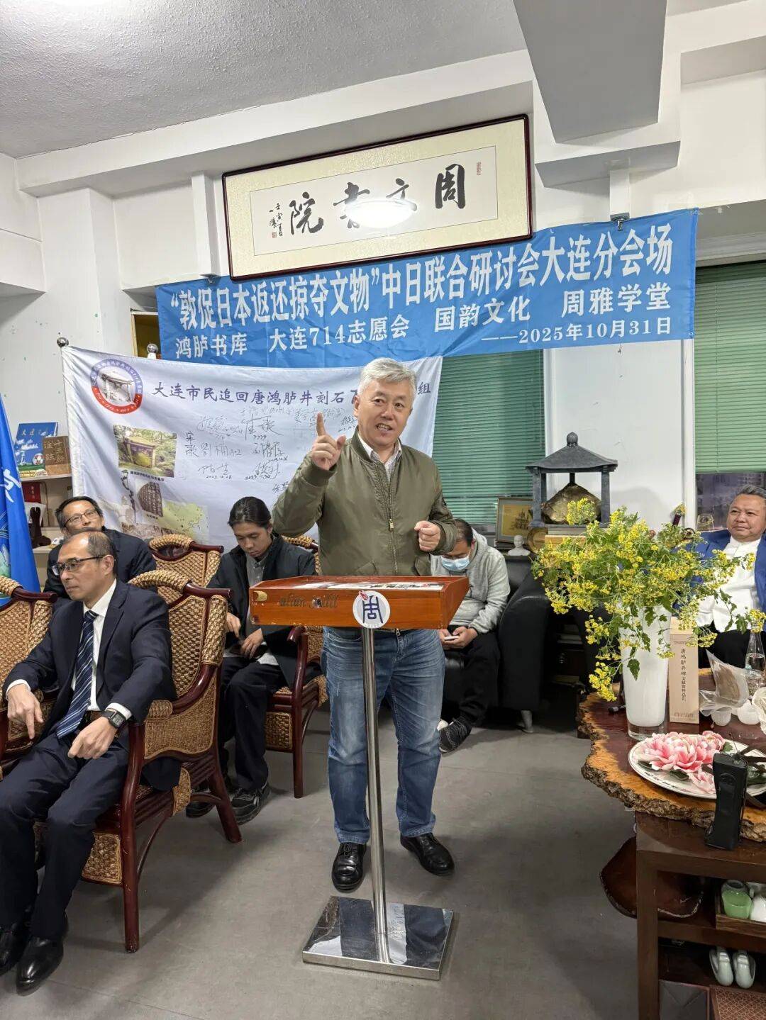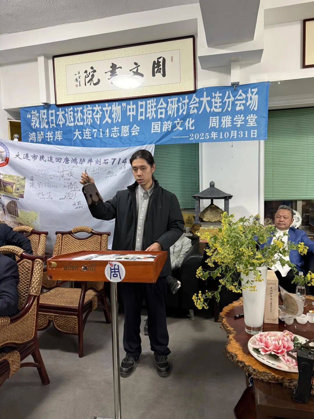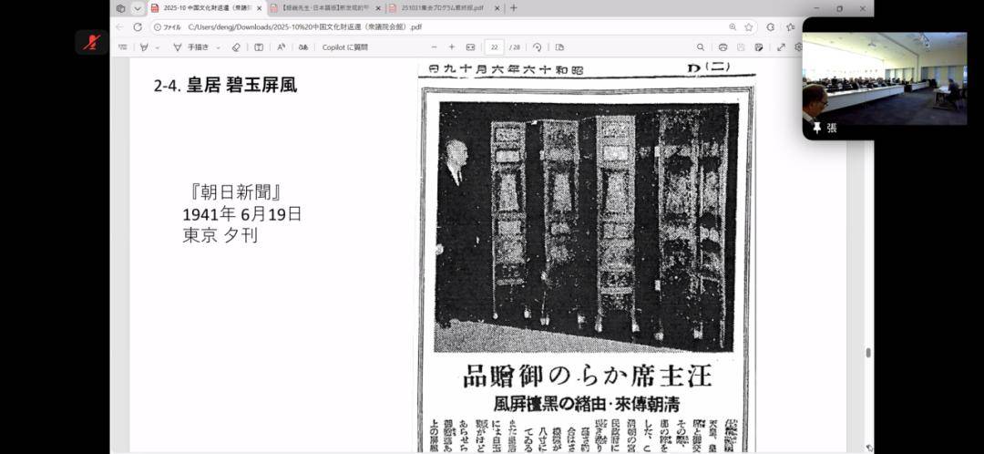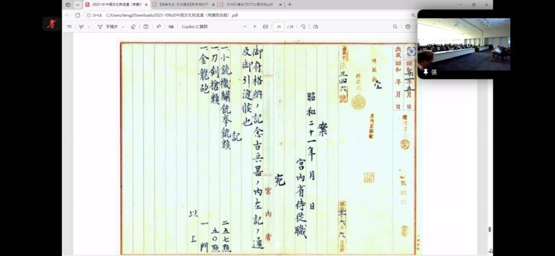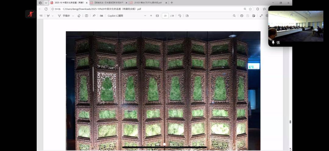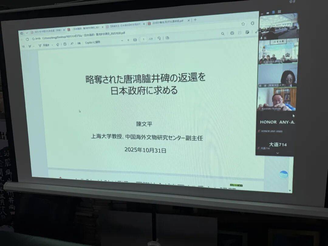 2025年10月31日下午,“敦促日本返还掠夺文物”中日联合线上研讨会顺利举行,会议设东京日本国会众议员会馆主会场与大连分会场,其中大连分会场由大连714志愿会、国韵文化、鸿胪书库、周雅学堂联合承办。来自中日两国的专家学者、志愿团体代表齐聚云端,围绕流失日本文物返还议题展开深入研讨,为推进文物追索工作凝聚共识。