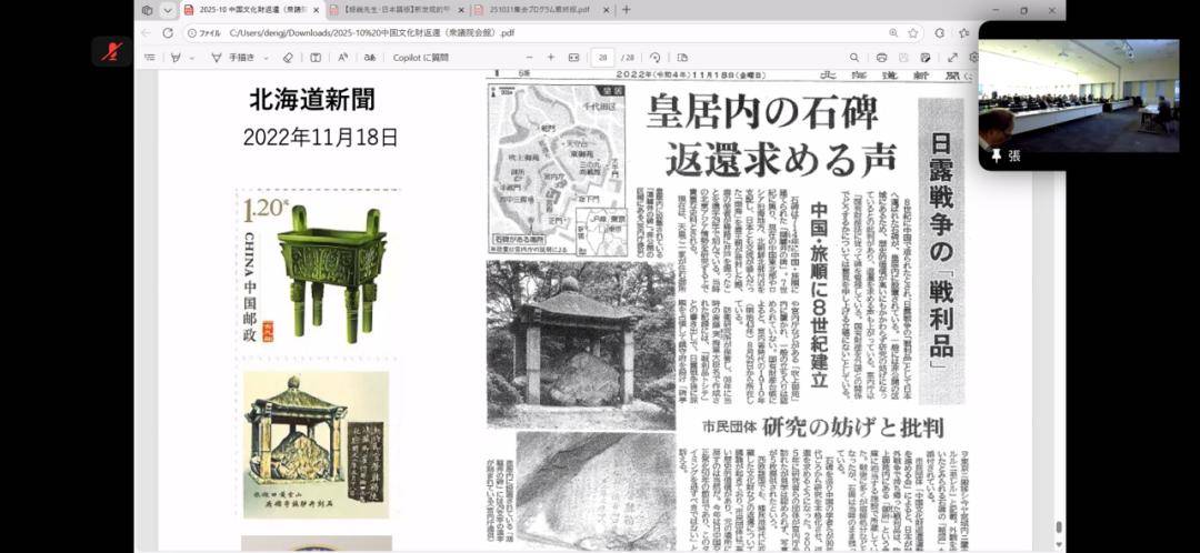 接着上海大学中国海外文物研究中心副主任陈文平先生聚焦《要求日本政府归还被掠夺的唐代鸿胪井碑》,详细阐述了该文物的历史价值与被掠夺的史实脉络。这是中国人第一次在日本国会发出返还中国国宝的诉求。并得到了多名国会议员参会声援,为追索返还唐鸿胪井碑的事业又推进一步,这是中日两国人士多年来共同努力的结果。