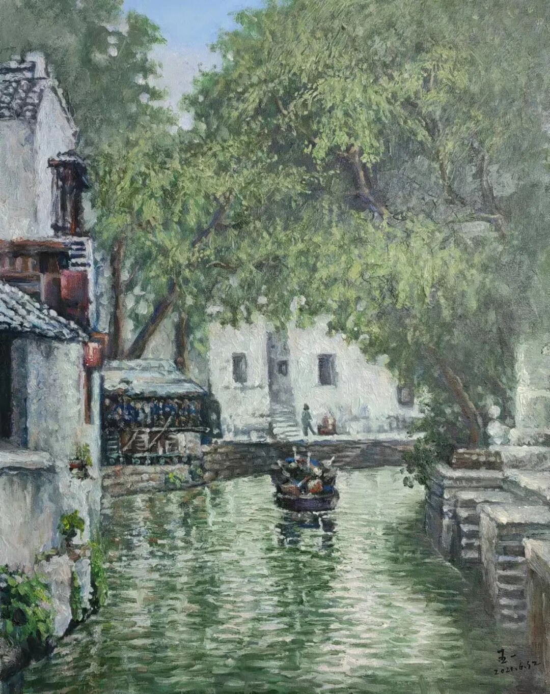他在油画里深情地回望水乡的波光拱桥,把记忆里的情愫寄托在画里,把现实里的温暖潜涵在创作中,每创作一件水乡油画作品,就是在谱写不忘乡音的心曲。画水乡江南吴冠中大师是带着中国画式的写意形式,去表现江南的轻盈空灵,大著其名。同样是画水乡,王一走的路径正是不随行于人后的重复,而是把印象主义的光影朦胧与古典主义的造型准确相结合,找到了自己抒发故乡情怀的创作新天地。从这个意义上来讲,王一画水乡有相当完美的专业技法支持,还有非凡的创新才华可以作出精彩的新表达!