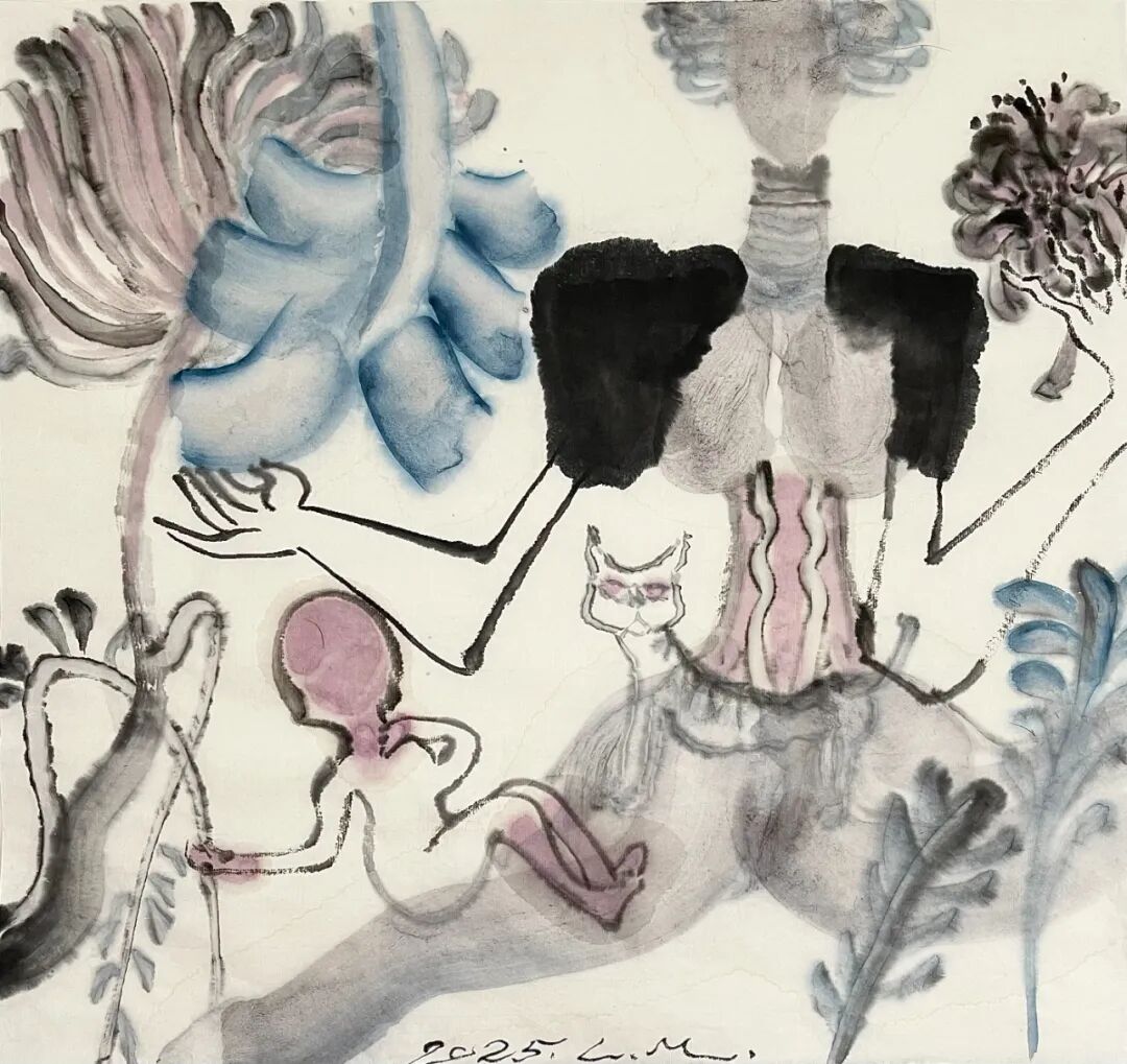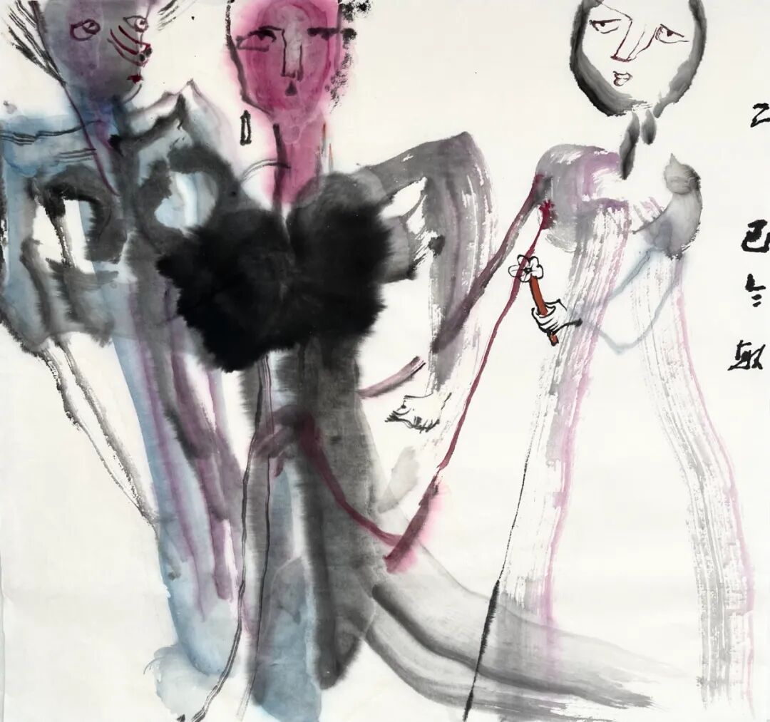 高令敏的新意象人物画,往往以简练而富有张力的线条勾勒人物形态,摒弃了传统人物画的精细描绘,转而追求一种更加内在、精神性的表达。在他的笔下,人物不再是具体的、现实的个体,而是化作了情感的载体,思想的象征。