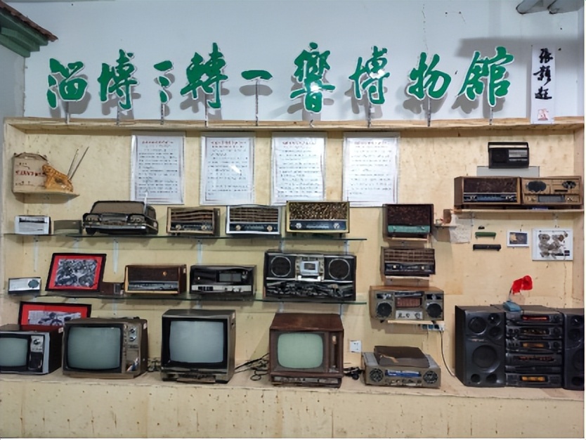 与山体相连的西屋内,摆放着淄博三转一响博物馆提供的馆藏珍品,有“上海”牌手表一块、青岛产二八大金鹿自行车一辆、上海产永久自行车一辆、日本产三洋M9930单卡收录机一部、上海产L601电子管录放机一部、北京产昆仑牌14吋双喇叭黑白电视机一台;旁边还有焦波先生听录音机的照片。
