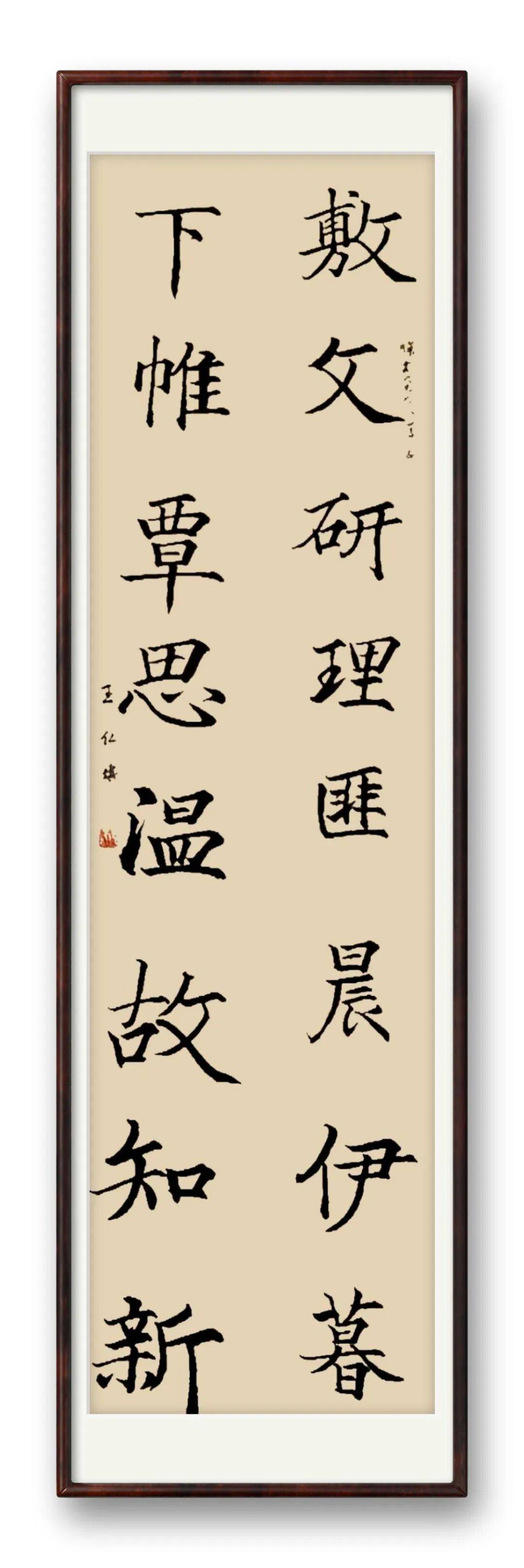 而难能可贵的是,先生并未在传统的窠臼中固步自封,而是以 “与古为新” 为创作圭臬,在传承中寻求突破。他笔下的汉字,既有传统书法的规整严谨,间架结构一丝不苟,尽显 “稳” 的根基;又涌动着锐意创新的鲜活气息,笔法运用上以中锋立骨、侧锋辅韵,在沉稳与劲健间寻得精妙平衡。章法布局中,他打破陈规却不逾矩,黑白虚实的排布既合传统审美,又含现代韵律,让古朴遒劲的气韵中多了几分率直洒脱的意趣,使观者在熟悉的笔墨语境中感受到全新的艺术张力。
