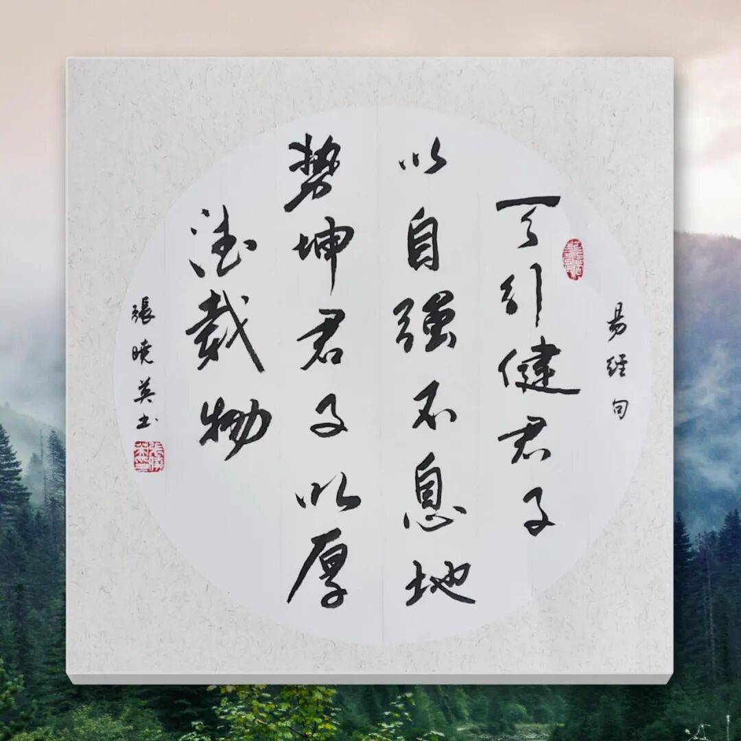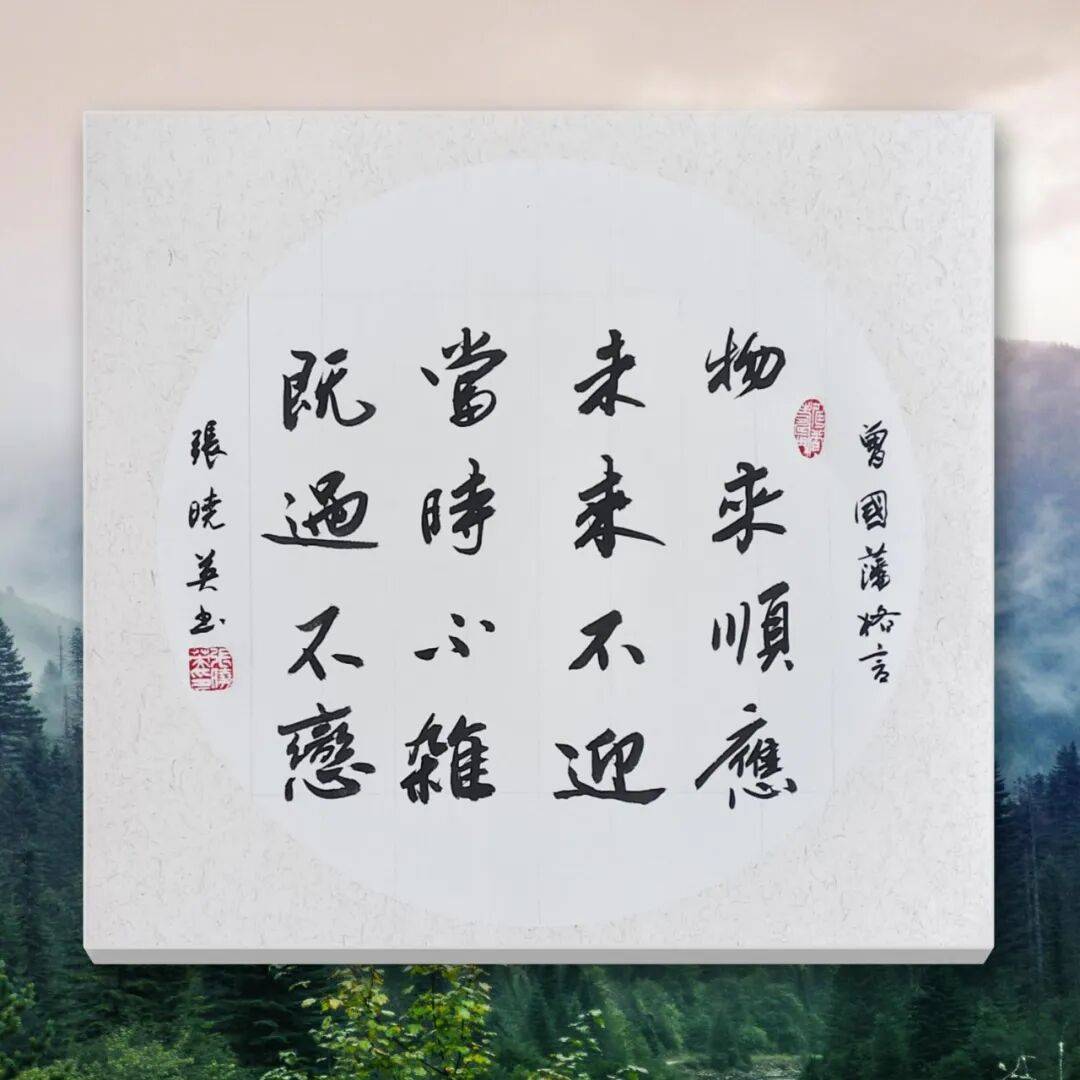 张晓英老师行笔流畅自然,笔画粗细变化间见功力,将儒家进取与包容的精神通过书法的韵律展现。字体布局疏密得当,在圆幅之中营造出舒展大气的视觉效果,让经典哲言的磅礴力量透过笔墨直抵观者心间,彰显出对传统文化内核的精准把握。其书法风格沉稳雅致,结字端庄规整,恰与格言所蕴含的处世智慧相契合。笔画间透着一份从容,将曾国藩的人生哲学以书法的形式具象化,使观者在欣赏笔墨的同时,能静心品味其中的修身之道。
