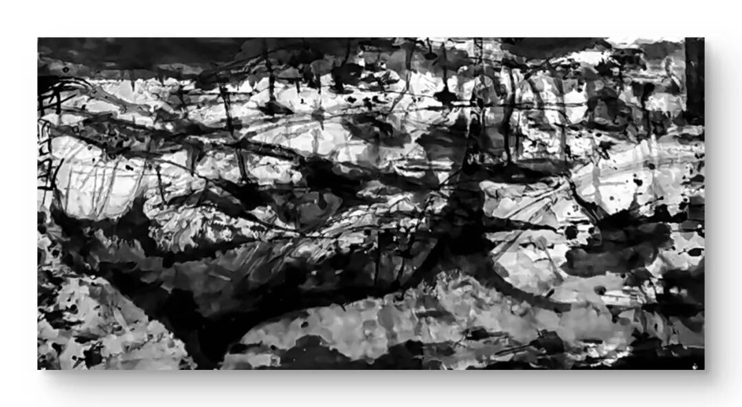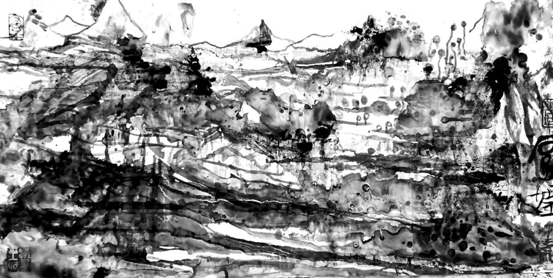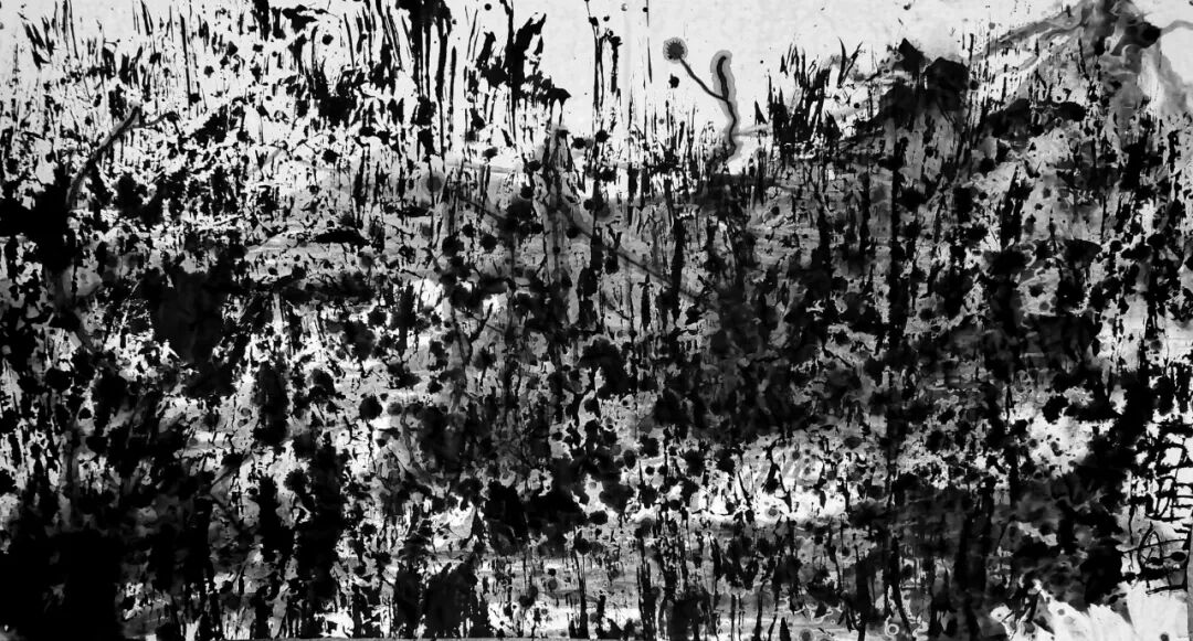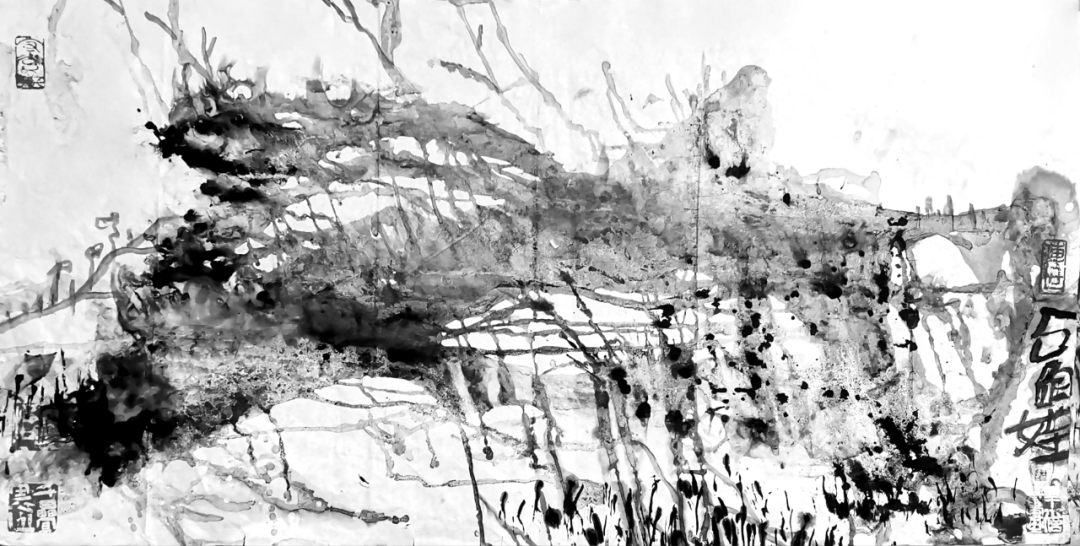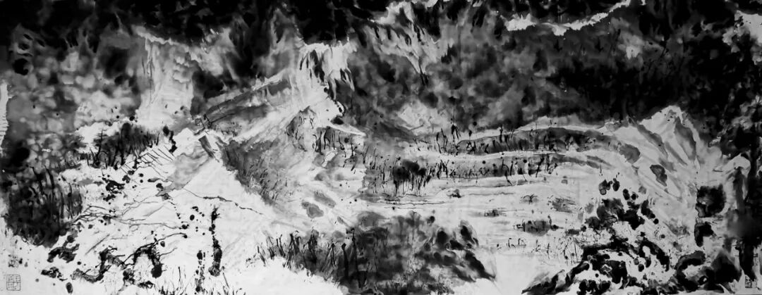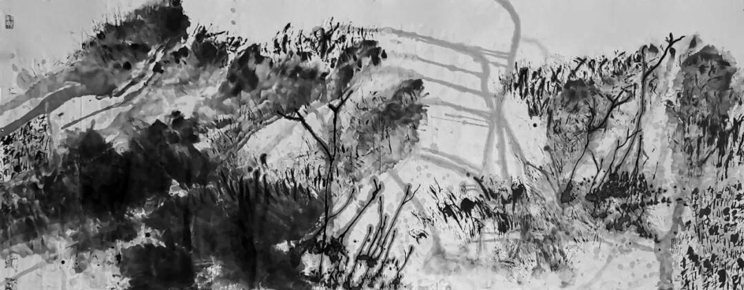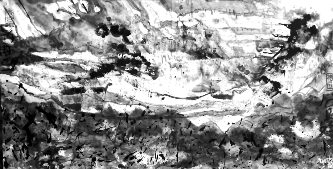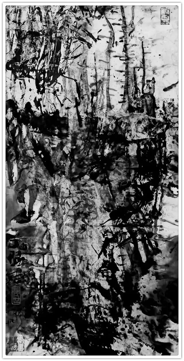 他的水墨语言极具标志性:一方面,他坚守传统文人画“以书入画”的核心要义,将行草书法的韵律感融入线条律动,使每一笔都饱含“写”的筋骨与气韵;另一方面,他大胆吸纳现代艺术的构成意识,通过墨色的浓淡对比、线条的疏密排布、空间的抽象切割,赋予传统水墨以现代视觉张力。观其作品,或有泼墨如骤雨倾泻,墨色在宣纸上自然晕染,暗合山水气韵的虚实相生;或有焦墨似铁刃刻石,以极简的黑白语汇构建出充满压迫感的精神场域。