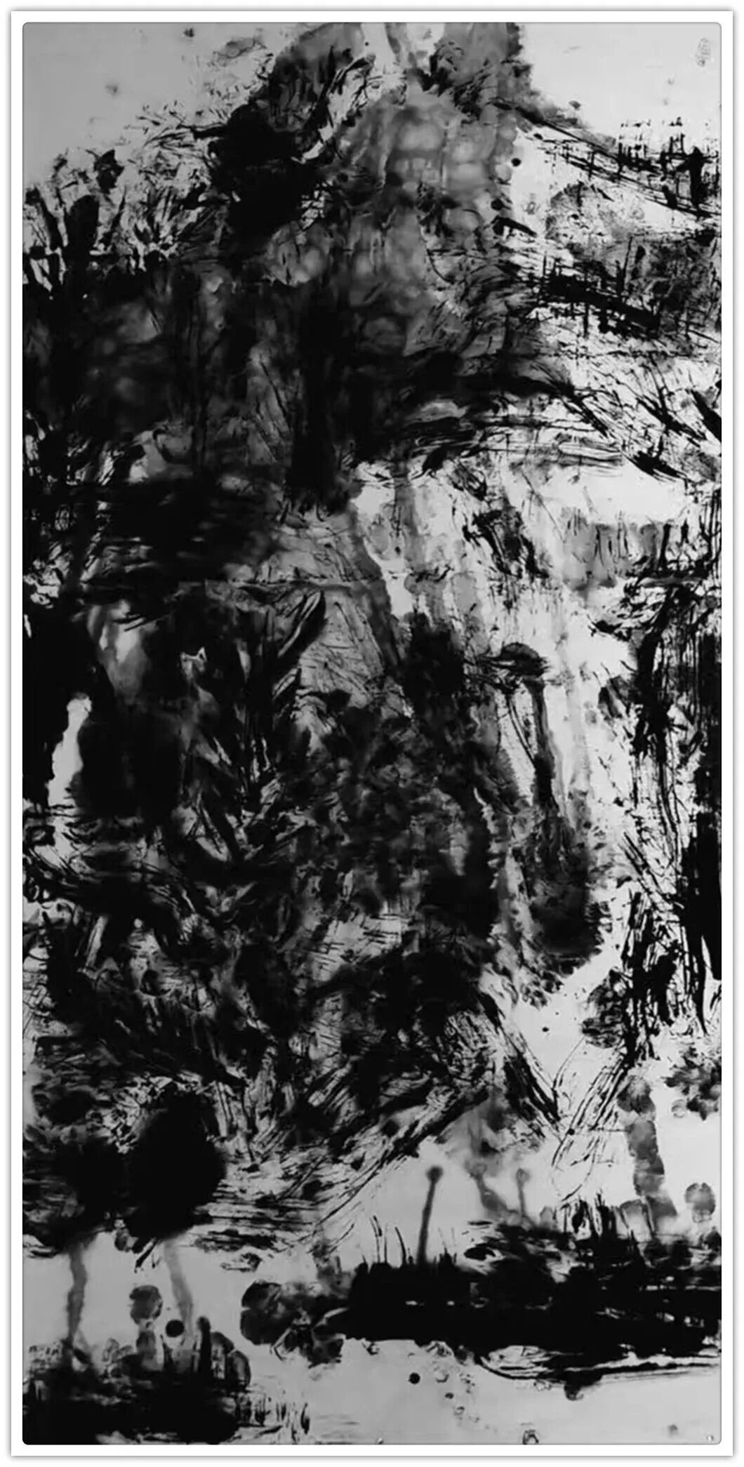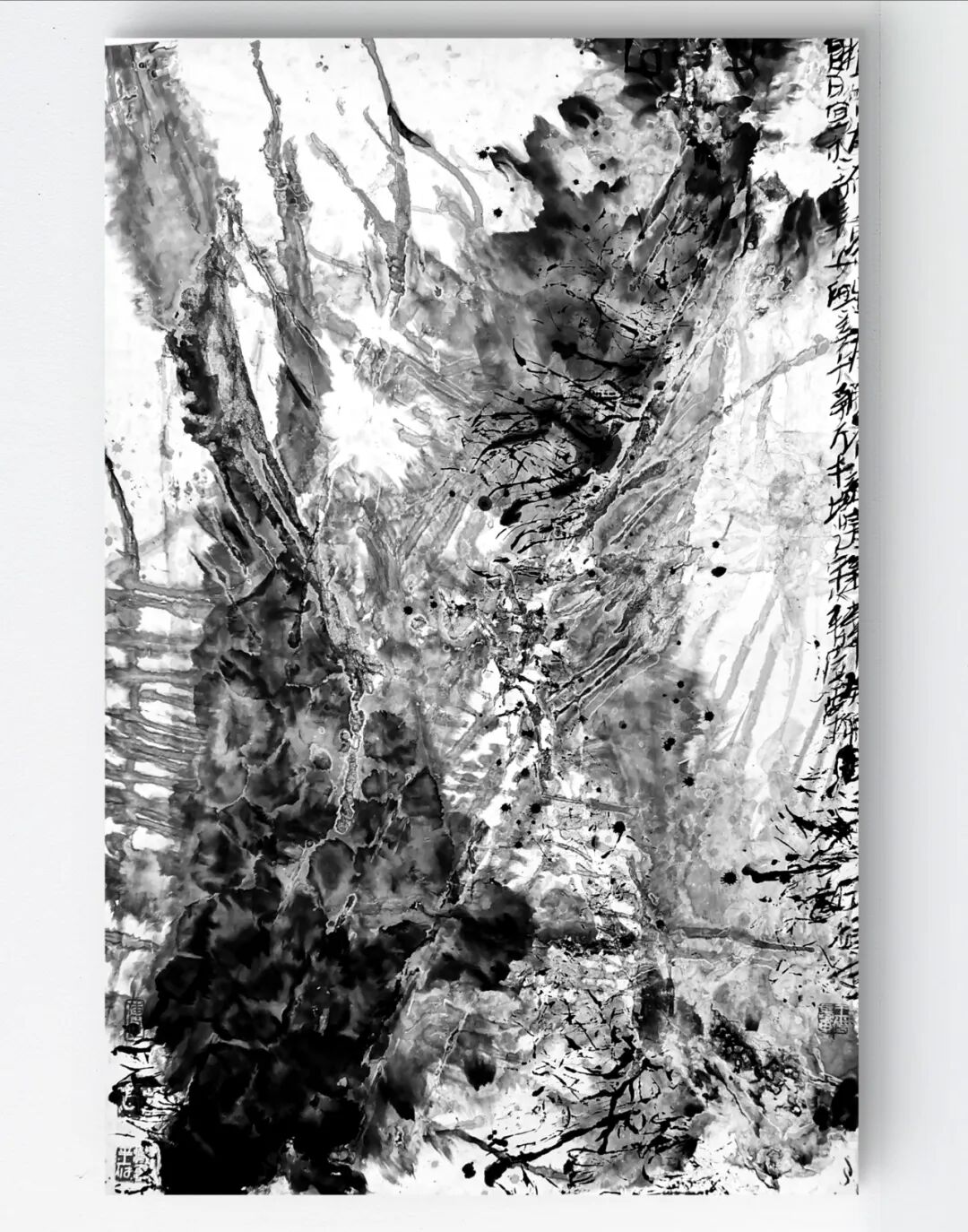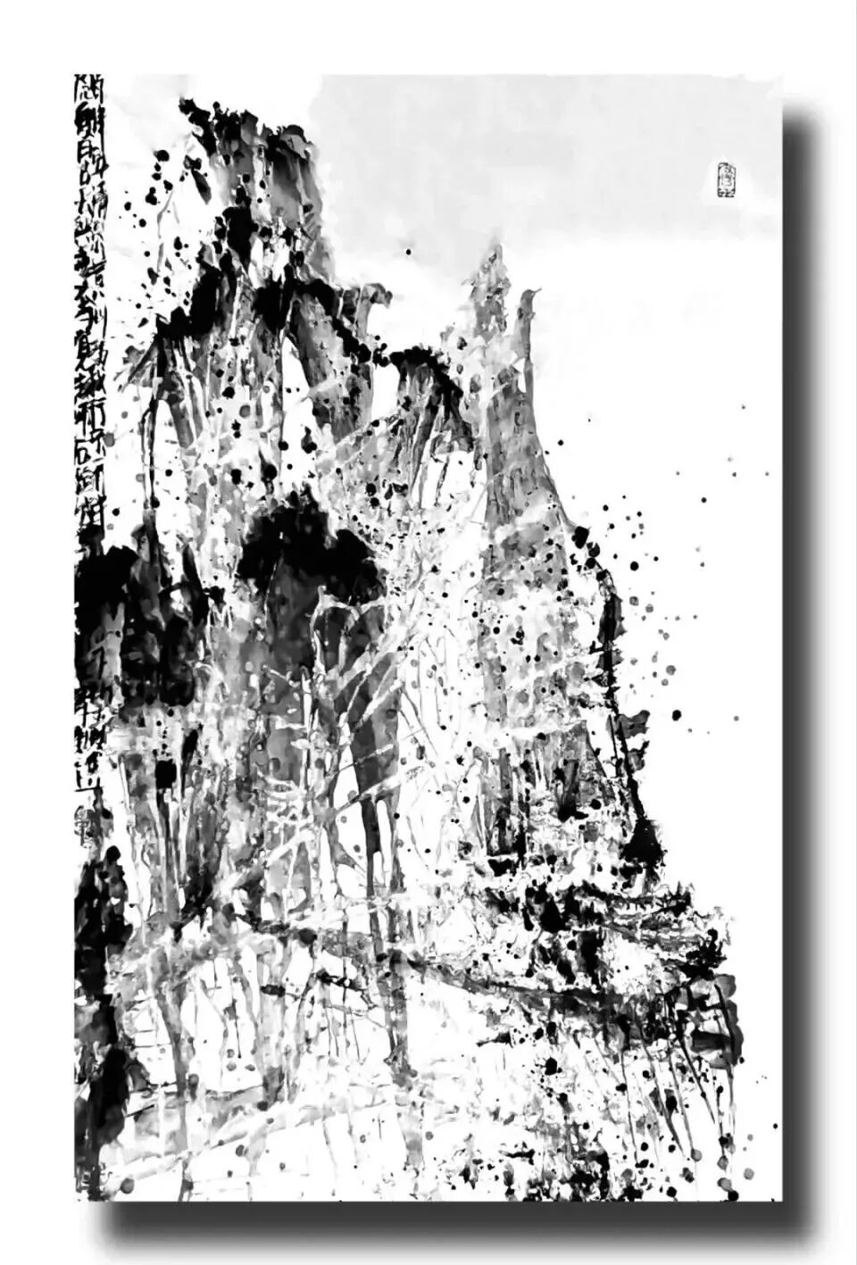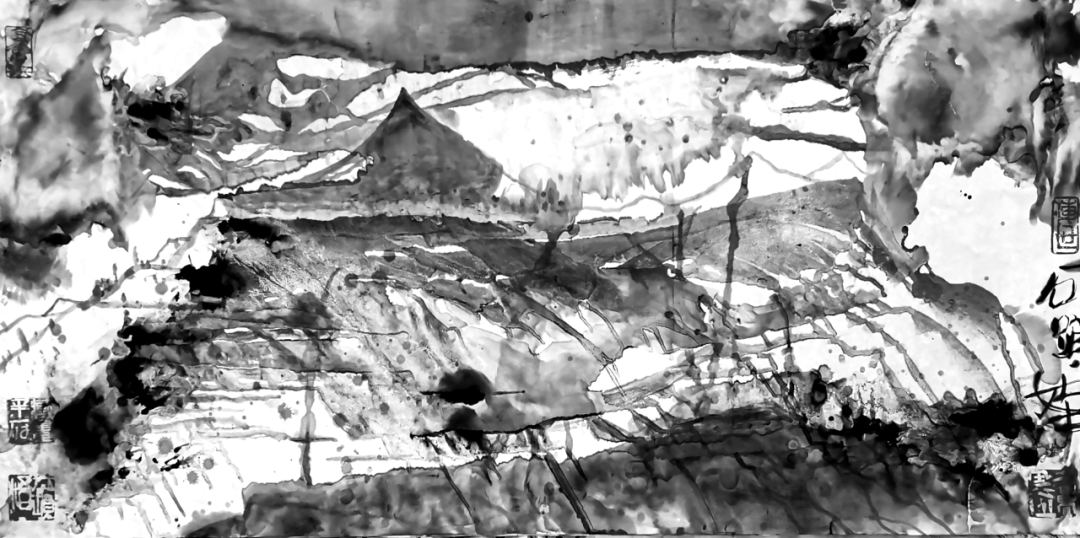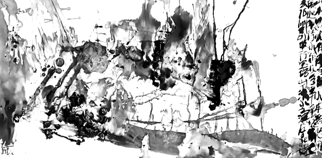 他的水墨语言极具标志性:一方面,他坚守传统文人画“以书入画”的核心要义,将行草书法的韵律感融入线条律动,使每一笔都饱含“写”的筋骨与气韵;另一方面,他大胆吸纳现代艺术的构成意识,通过墨色的浓淡对比、线条的疏密排布、空间的抽象切割,赋予传统水墨以现代视觉张力。观其作品,或有泼墨如骤雨倾泻,墨色在宣纸上自然晕染,暗合山水气韵的虚实相生;或有焦墨似铁刃刻石,以极简的黑白语汇构建出充满压迫感的精神场域。