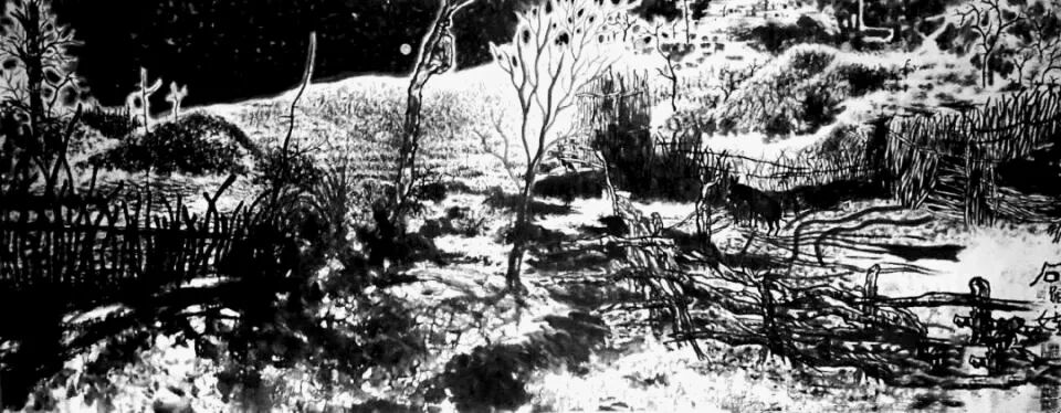 在他的水墨作品中,或是沟壑纵横的高原肌理,以狂放的墨线与浓淡交织的块面,还原出黄土高原“天苍苍、野茫茫”的雄浑气象;或是雪落窑洞的静谧村落,以极简的黑白对比,勾勒出陕北民居质朴憨态的烟火气息。这种对乡土题材的书写,绝非停留在“风景再现”的表层,而是深入到黄土地的文化骨髓——那些扭曲如老树根的线条,是庄稼汉脊梁的倔强弧度;那些沉郁如古陶的墨色,是黄土高原千万年岁月沉淀的精神包浆。正是这份源于生命体验的情感羁绊,让他的作品拥有了直击人心的原始力量,成为黄土地人文精神的视觉史诗。