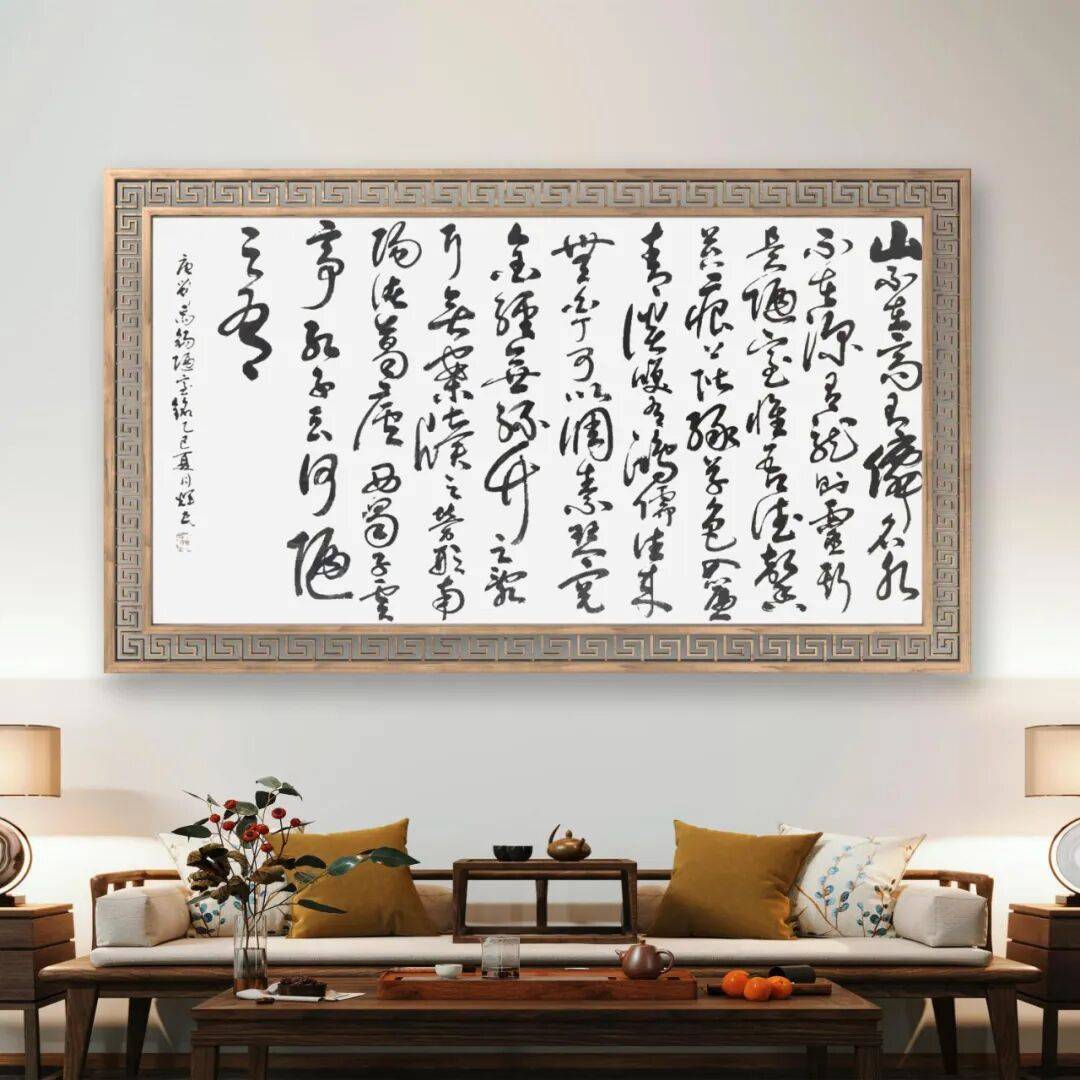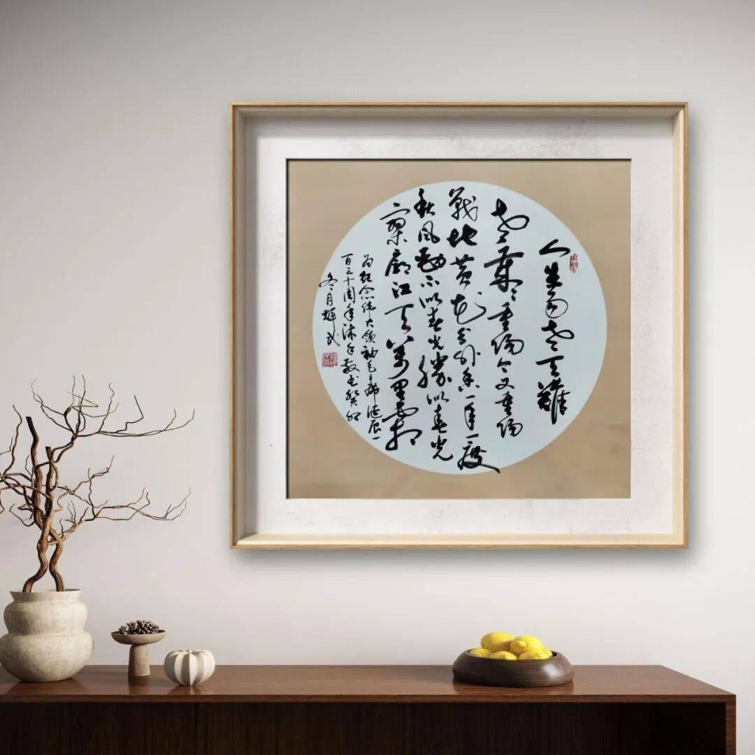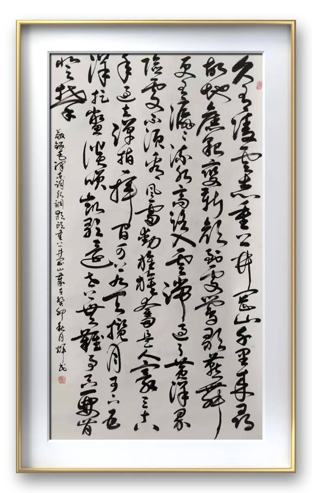 而草书,则是谭辉民老师艺术个性的极致释放,尽显 “笔走龙蛇,气象万千” 之态。草书最能体现书写者的情感与个性,讲究 “破体出新,纵情挥洒”,但自由之下,仍需以法度为纲,否则便成 “野狐禅”。谭辉民老师的草书,无疑是 “放而不纵,狂而有度” 的典范。他的草书作品,线条奔放不羁,笔画简练传神,时而笔走龙蛇,一气呵成;时而戛然而止,留有余韵。字形虽简,却意蕴丰富,省去了不必要的修饰,只保留最核心的笔墨精神,于潦草中见风骨,于狂放中显理性。整幅作品布局疏密错落,墨色浓淡相间,枯湿互映,如疾风骤雨,气势磅礴,却又章法井然,让人感受到草书独有的豪放之美、写意之美。这份 “放得开,收得住” 的功力,正是他二十载兼修不辍的最好证明,彰显了其对书法艺术规律的深刻洞察与灵活运用。
