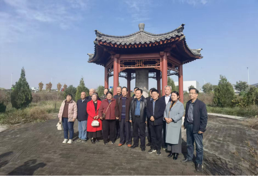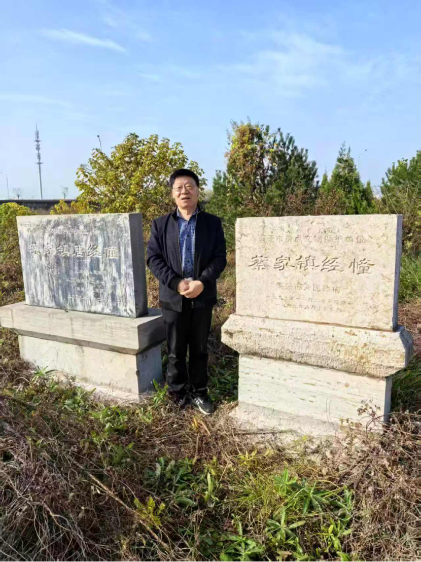 初冬时节,我们莱芜散文学会作家和陨石协会的收藏家们踏访莱芜蔡家镇村,寻访那座承载着千年秘密的唐经幢。穿过重汽厂区来到西南角,一座青石构筑的古幢骤然出现我们面前,与周围的现代工业场景形成奇妙的时空对话。仰望此幢,通高三丈六尺,由盖、身、座三部分构成,虽历经1300余年的风雨侵蚀,依旧骨峻韵扬。幢盖如八角亭翘,飞檐欲逐云影,顶端雕刻的四尊佛像垂慈而立,衣袂翩跹间尽显庄严法相;幢身呈八棱柱挺拔而起,以鲁山青石为材,石质坚润如凝岱宗灵秀,历千霜而不腐;莲花基座方稳厚重,瓣尖内勾含韵,石阶四向通津,暗合禅意的同时,更似承托天地之气脉的磐石。