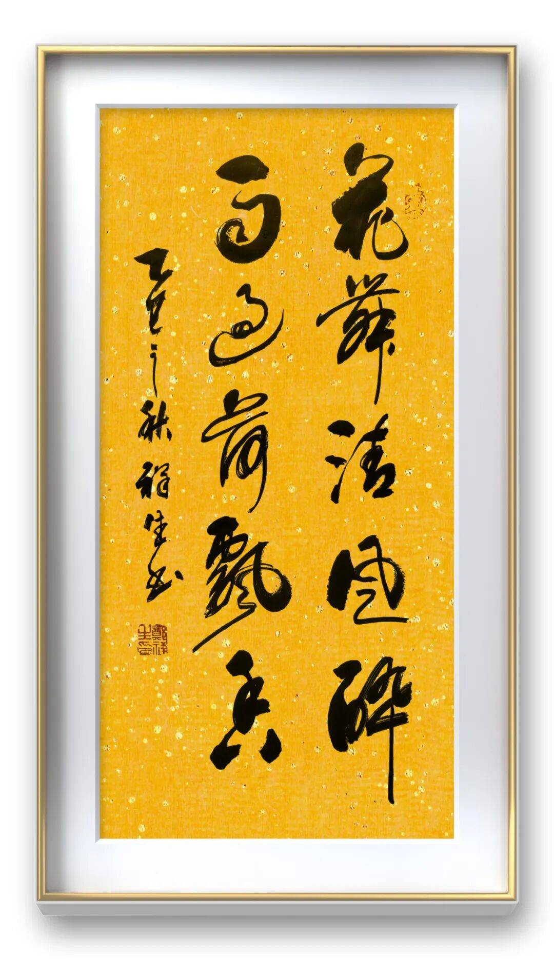 草书方面,先生的作品同样令人赞叹。他的草书取法张旭、怀素,却不追求狂怪险绝,而是在奔放中蕴含着理性的节制,在洒脱中保持着章法的严谨。其用笔迅疾而不失沉稳,线条飞动而不失质感,笔画连绵缠绕,却又脉络清晰,疏密得当。结字上,他注重整体气势的营造,字与字之间、行与行之间相互穿插,错落有致,形成了开合有度、跌宕起伏的章法布局。观其草书,笔墨酣畅淋漓,气势磅礴,如江河奔涌,一气呵成,将李白诗中的豪迈之情与豁达之气表现得恰到好处,让人在欣赏书法艺术的同时,感受到诗歌与书法的完美融合。