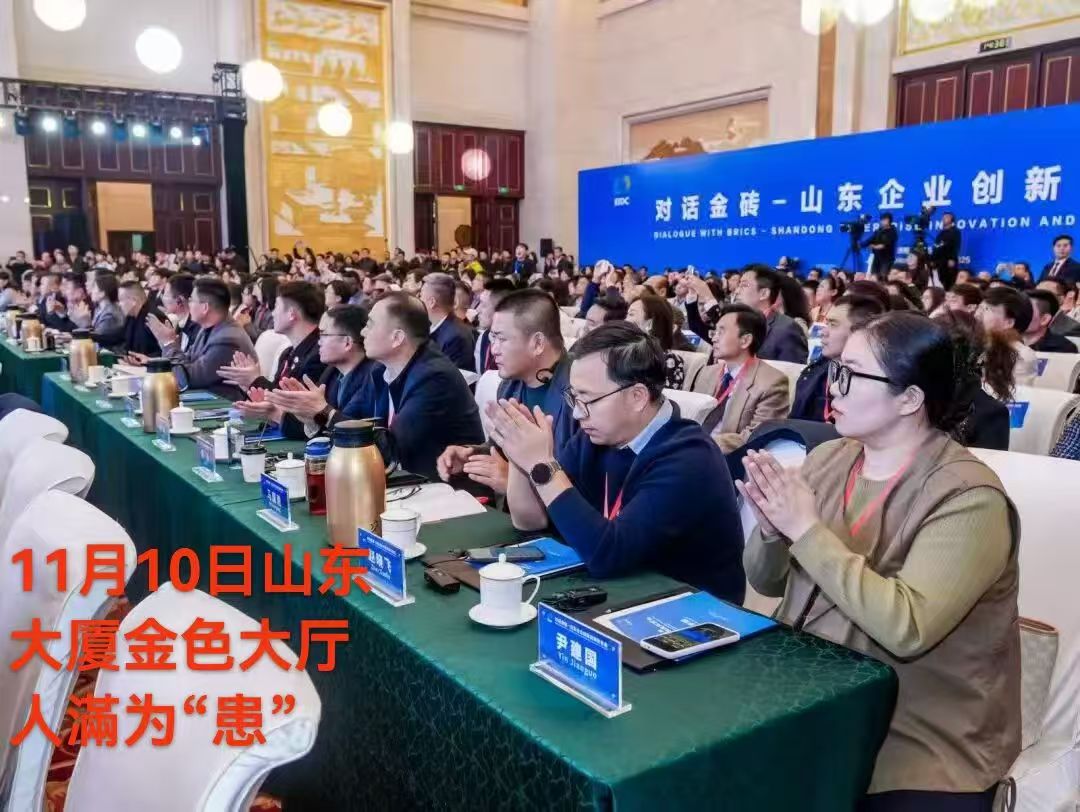 海促会济南电: 11月10日,以“共筑金砖合作新纽带 共享山东发展新机遇为主题的“对话金砖—一山东企业创新发展交流会”在济南山东大厦隆重举行并圆满落幕。本次活动由山东省贸促会主办,吸引了来自巴西、俄罗斯、南非、沙特阿拉伯、埃及、阿联酋、埃塞俄比亚、马来西亚、越南、白俄罗斯、乌兹别克斯坦、刚果(金)、博茨瓦纳等30多个国家和地区的50余家商协会组织、企业代表,以及约180家国内企业,共计400余位嘉宾齐聚一堂,共商合作。
