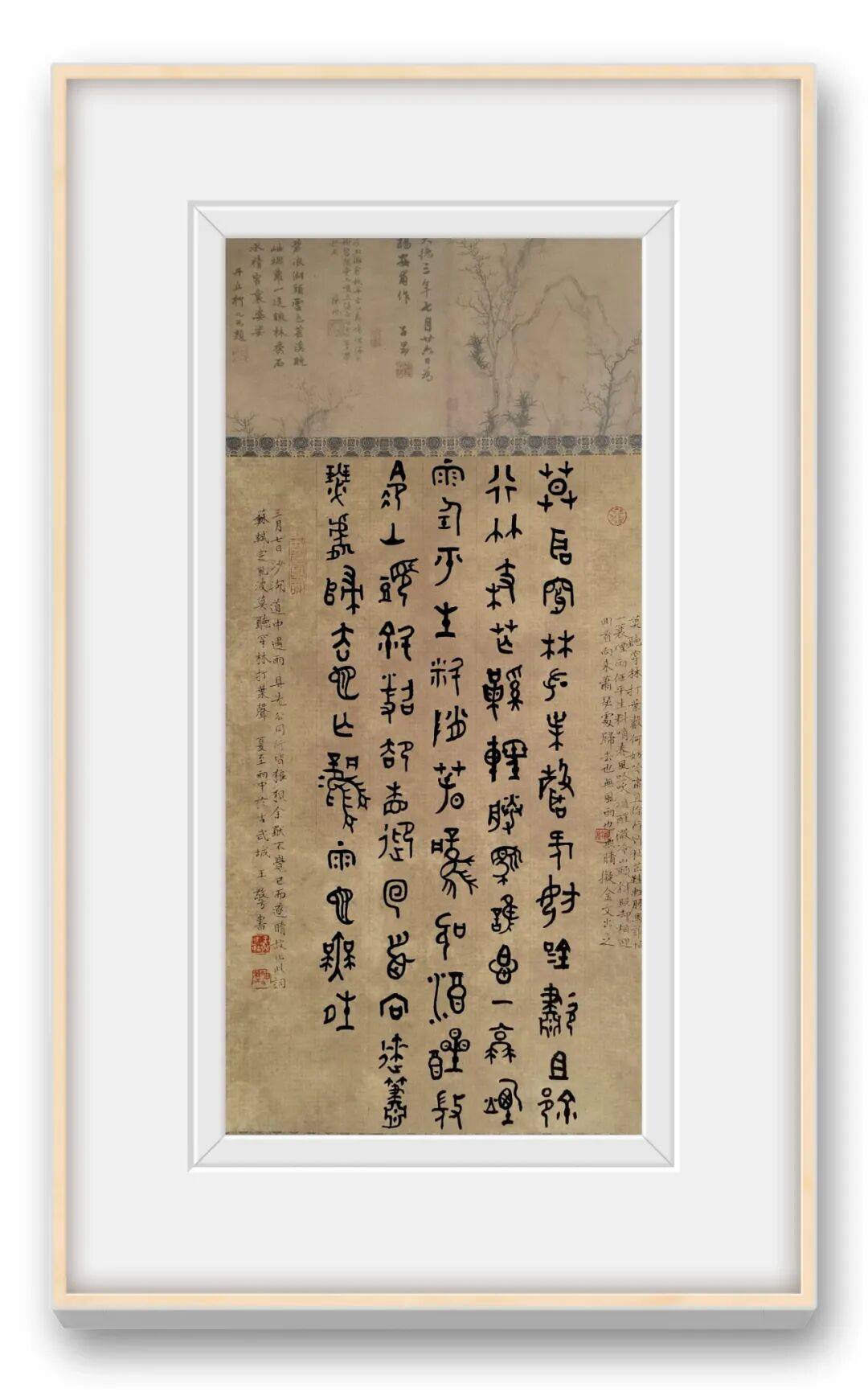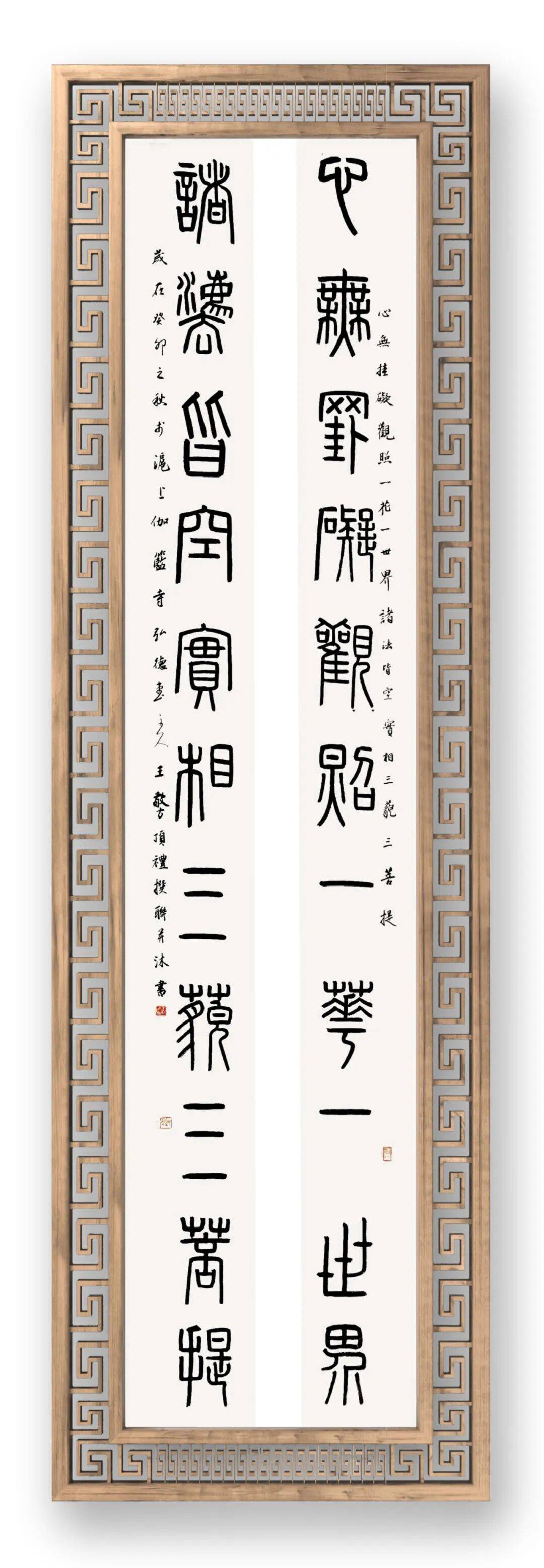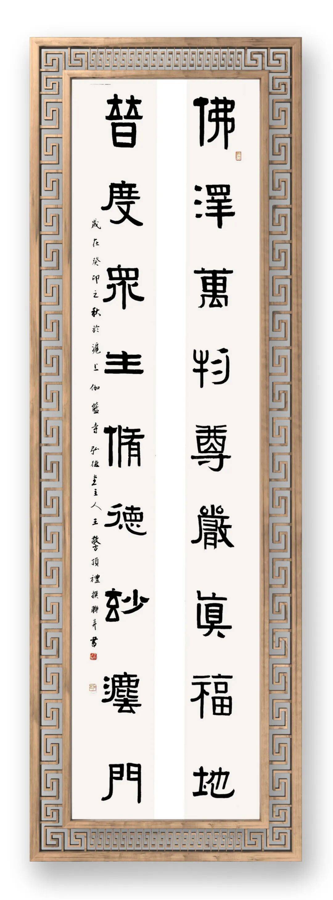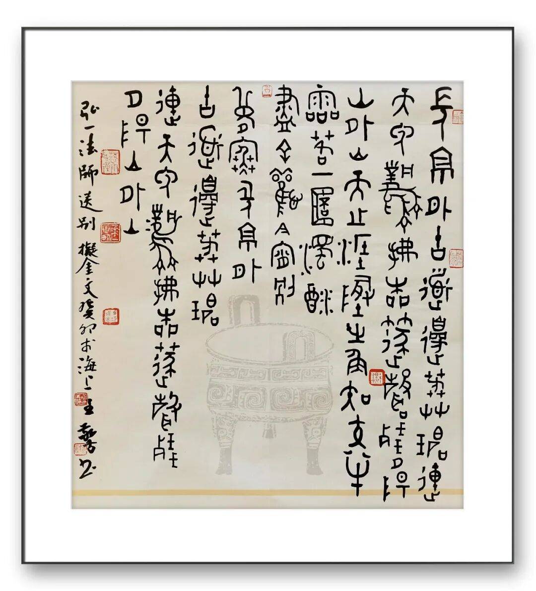 王敬方先生的众幅作品的布局,以传统书法的 “纵有行,横无列” 为骨架,却因金文的字形特点而呈现出独特的节奏感。这种布局既借鉴了金文碑版(如青铜器铭文的排版逻辑)的秩序感,又融入了文人书法的书卷气韵,尤其是题款中 “弘一法师送别” 的人文意涵,让书法作品超越了单纯的技法展示,成为文化情感的载体。背景的青铜鼎图案,并非装饰性的附庸,而是与金文书法形成 “互文”,强化了作品的历史纵深感,暗示着书法与青铜文化的血脉联系。