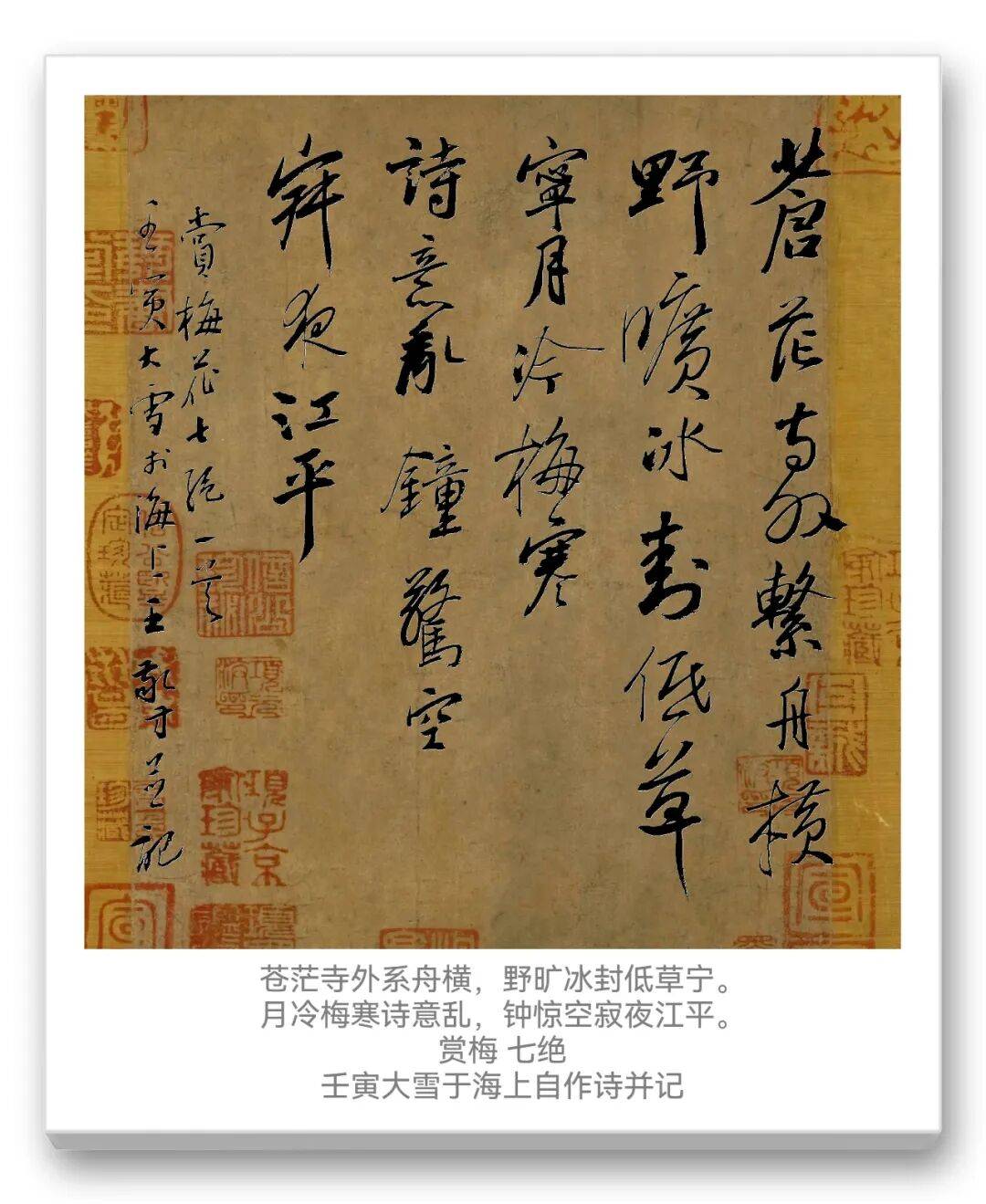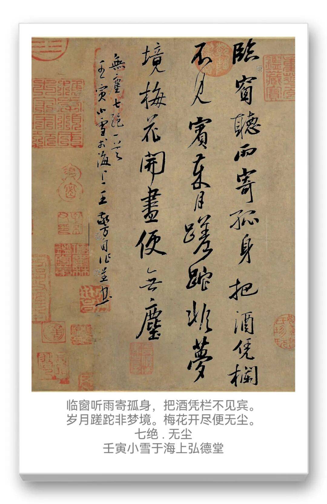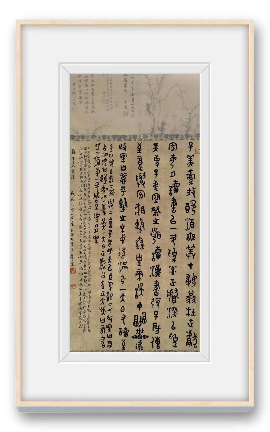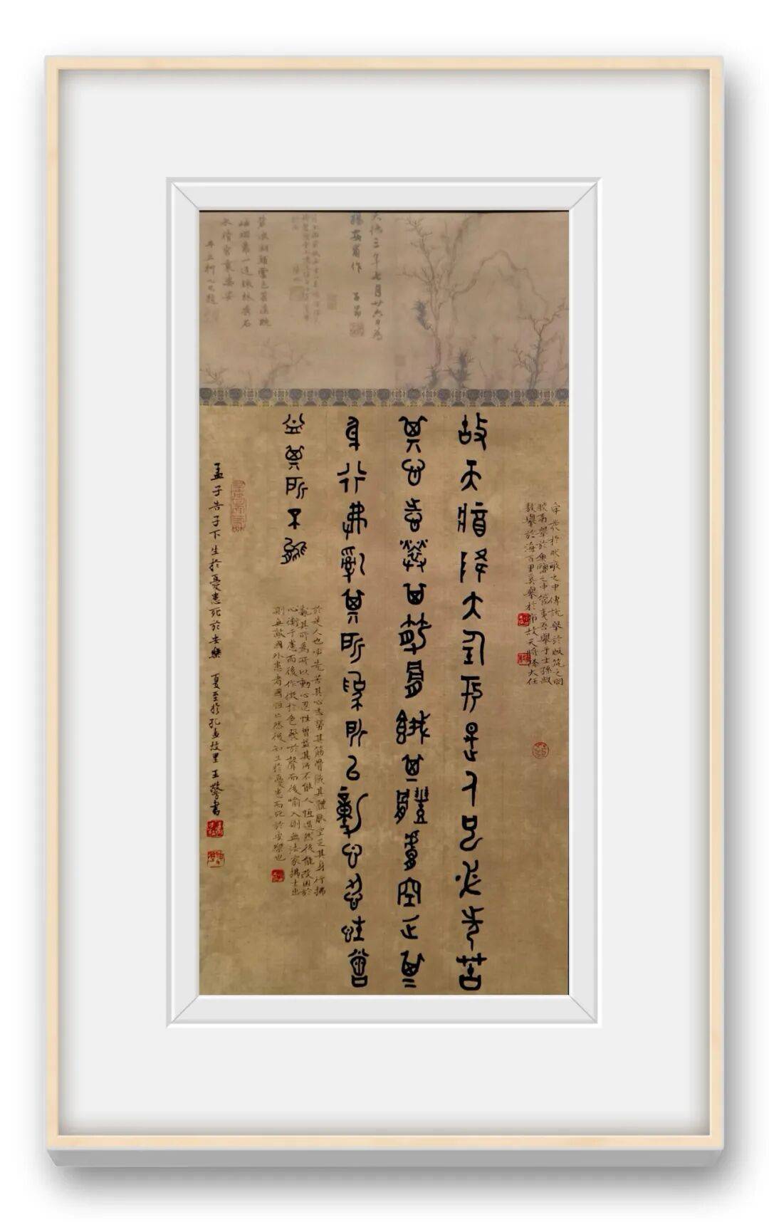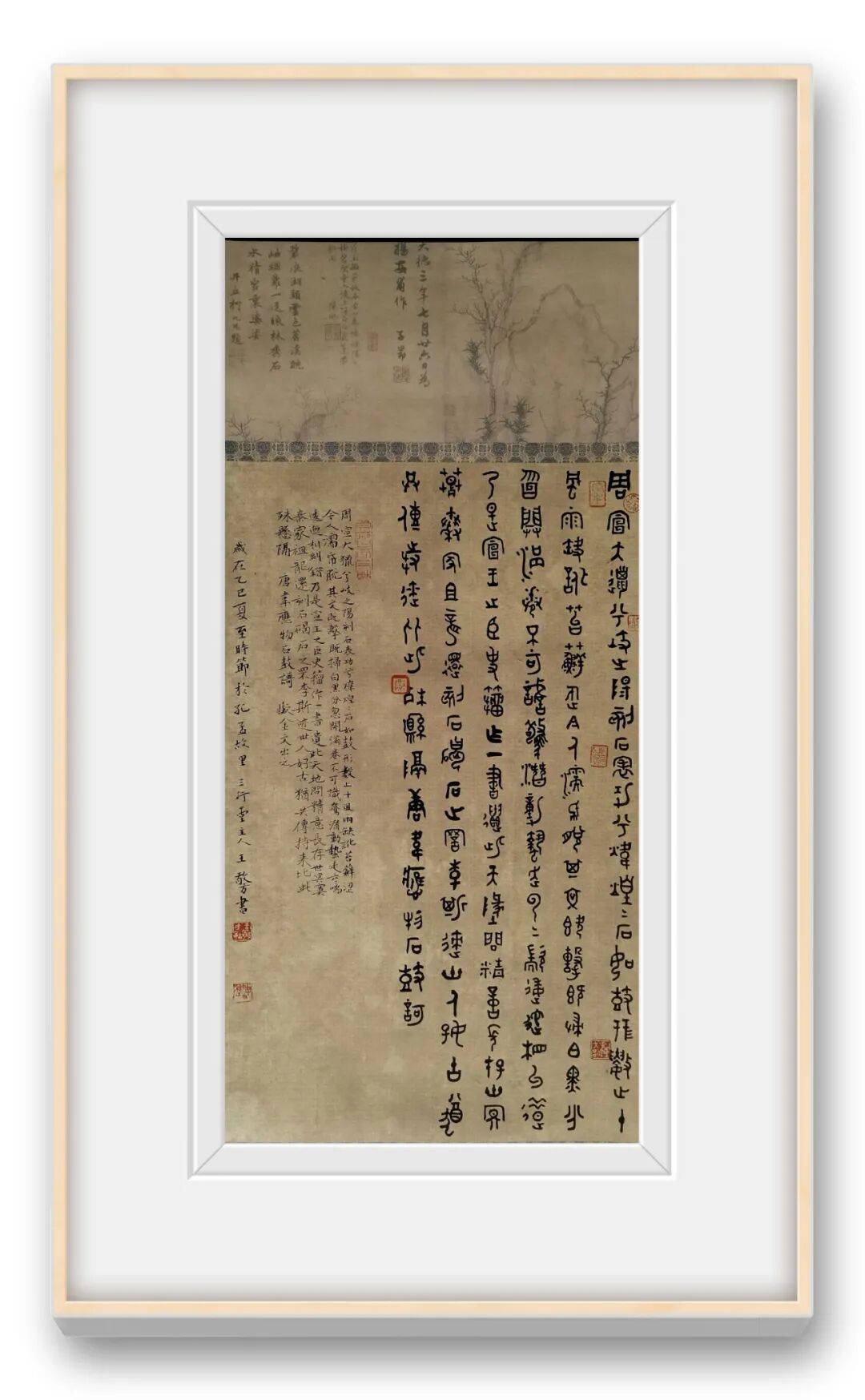 王敬方先生的众幅作品的布局,以传统书法的 “纵有行,横无列” 为骨架,却因金文的字形特点而呈现出独特的节奏感。这种布局既借鉴了金文碑版(如青铜器铭文的排版逻辑)的秩序感,又融入了文人书法的书卷气韵,尤其是题款中 “弘一法师送别” 的人文意涵,让书法作品超越了单纯的技法展示,成为文化情感的载体。背景的青铜鼎图案,并非装饰性的附庸,而是与金文书法形成 “互文”,强化了作品的历史纵深感,暗示着书法与青铜文化的血脉联系。