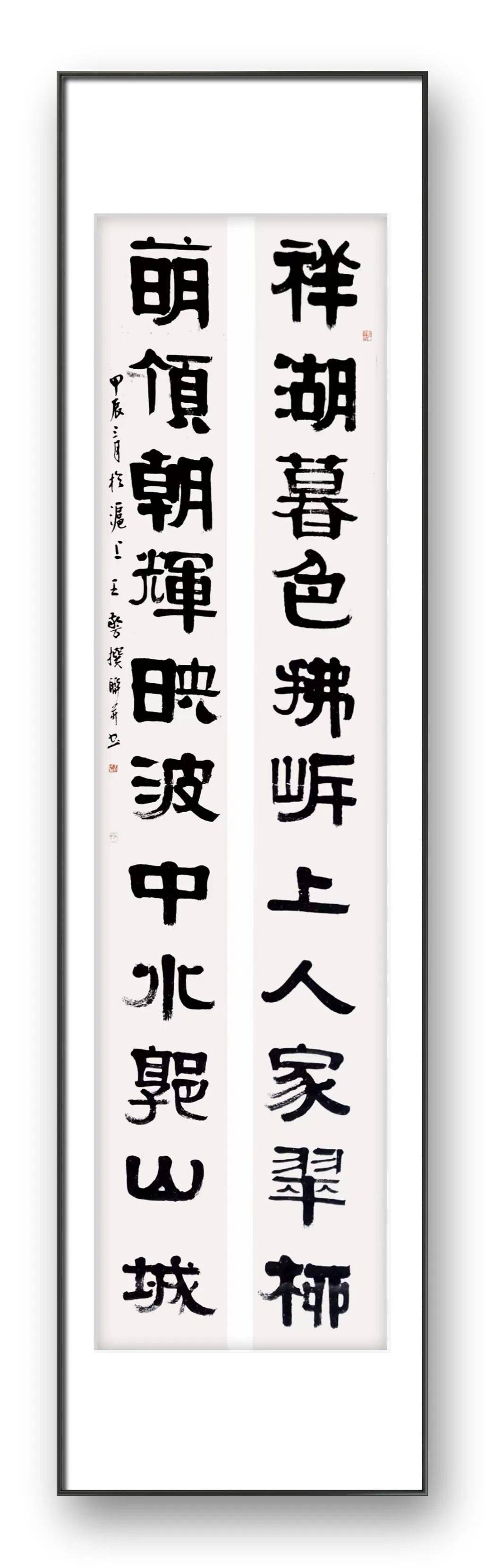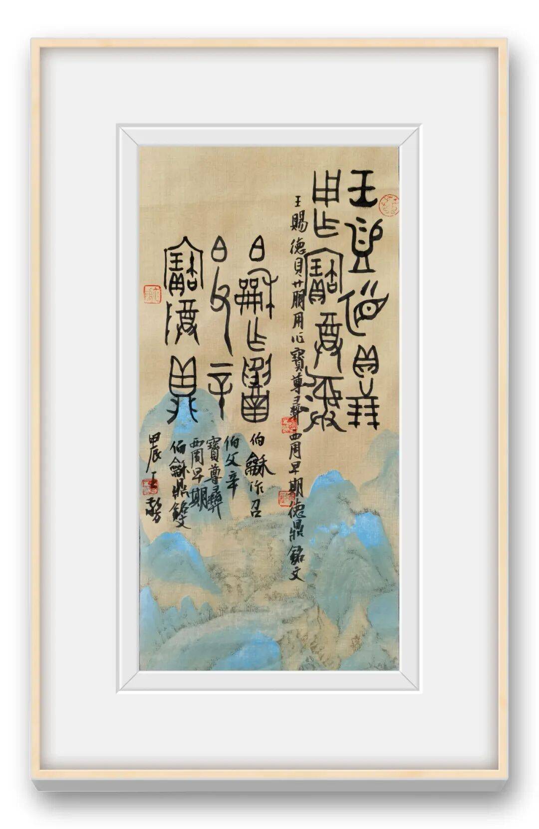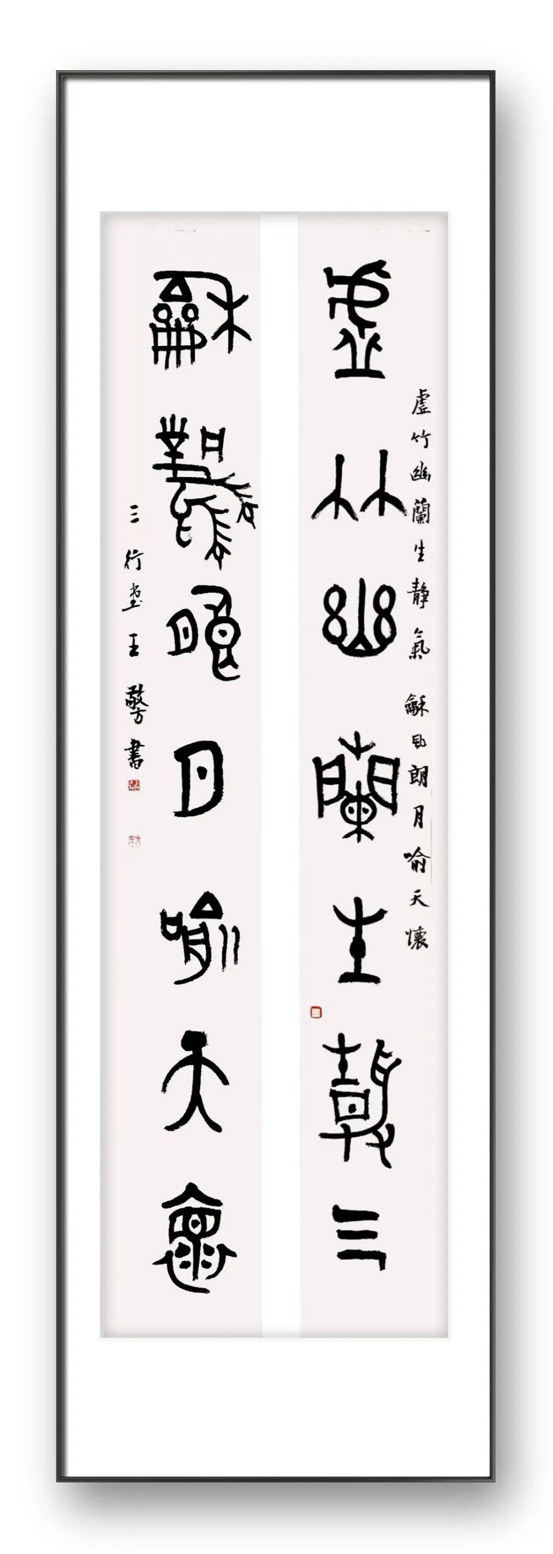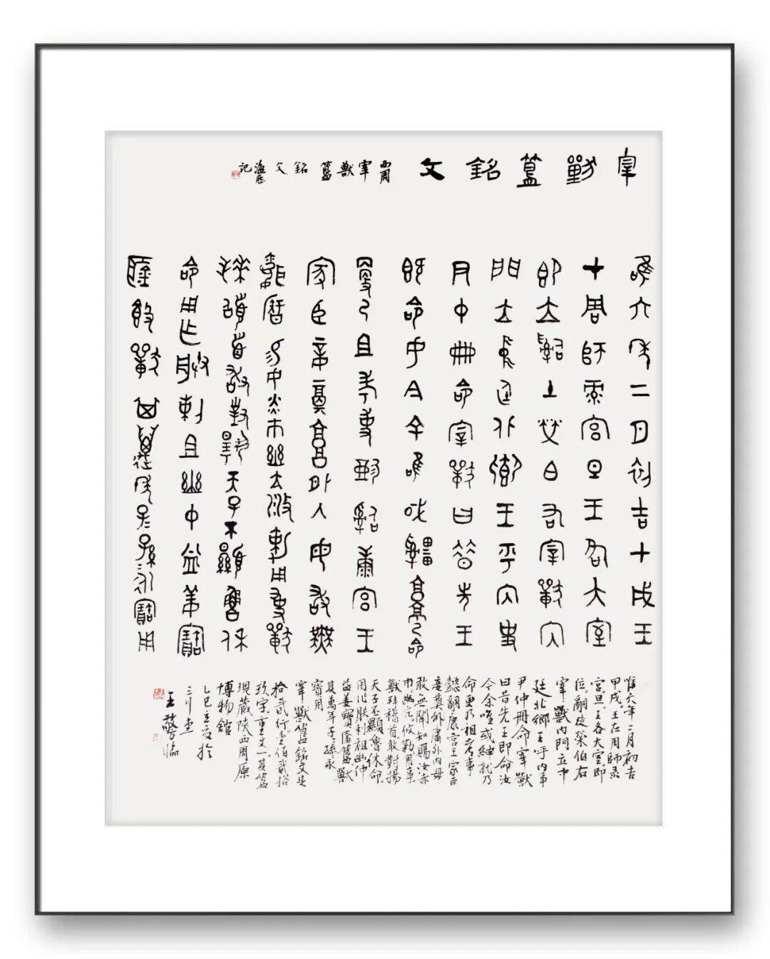 金文,作为铸刻于商周青铜器上的文字,是中国古文字发展历程中极具代表性的形态。它脱胎于甲骨文,却在青铜礼器的承载下,发展出雄浑厚重的线条质感与端庄肃穆的字形结构,是 “器以载道” 的礼乐文化在文字艺术上的直观体现。王老师的作品,以 “拟金文” 为创作路径,并非简单的字形模仿,而是深入金文书法的精神内核进行再创作。王敬方先生的创作既有对经典书体的致敬,又有明确的时代与个人印记。在当代书法创作多聚焦于行草、篆隶的潮流中,选择金文这一相对小众的书体进行创作,本身就体现了书者对书法史脉络的清晰认知与对古雅审美趣味的执着追求。