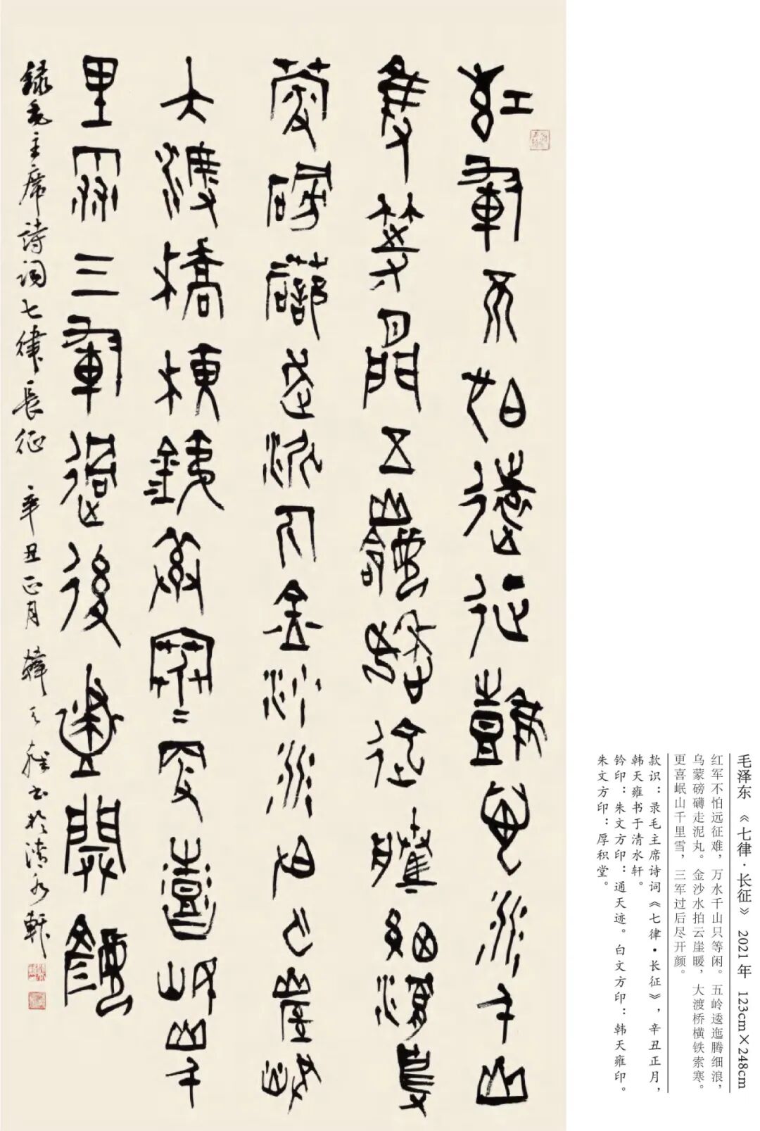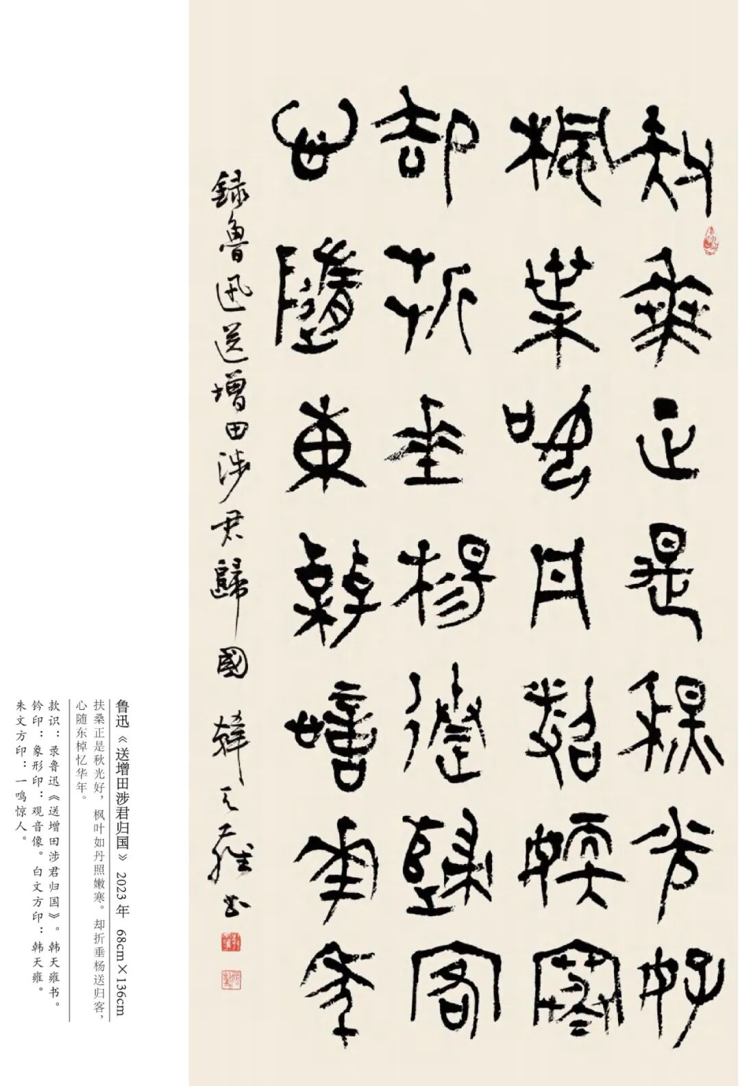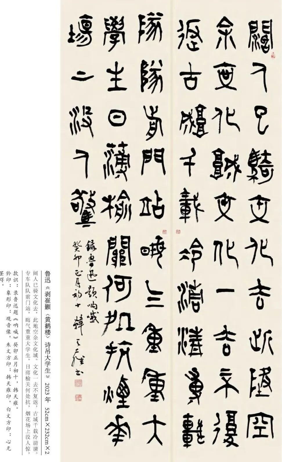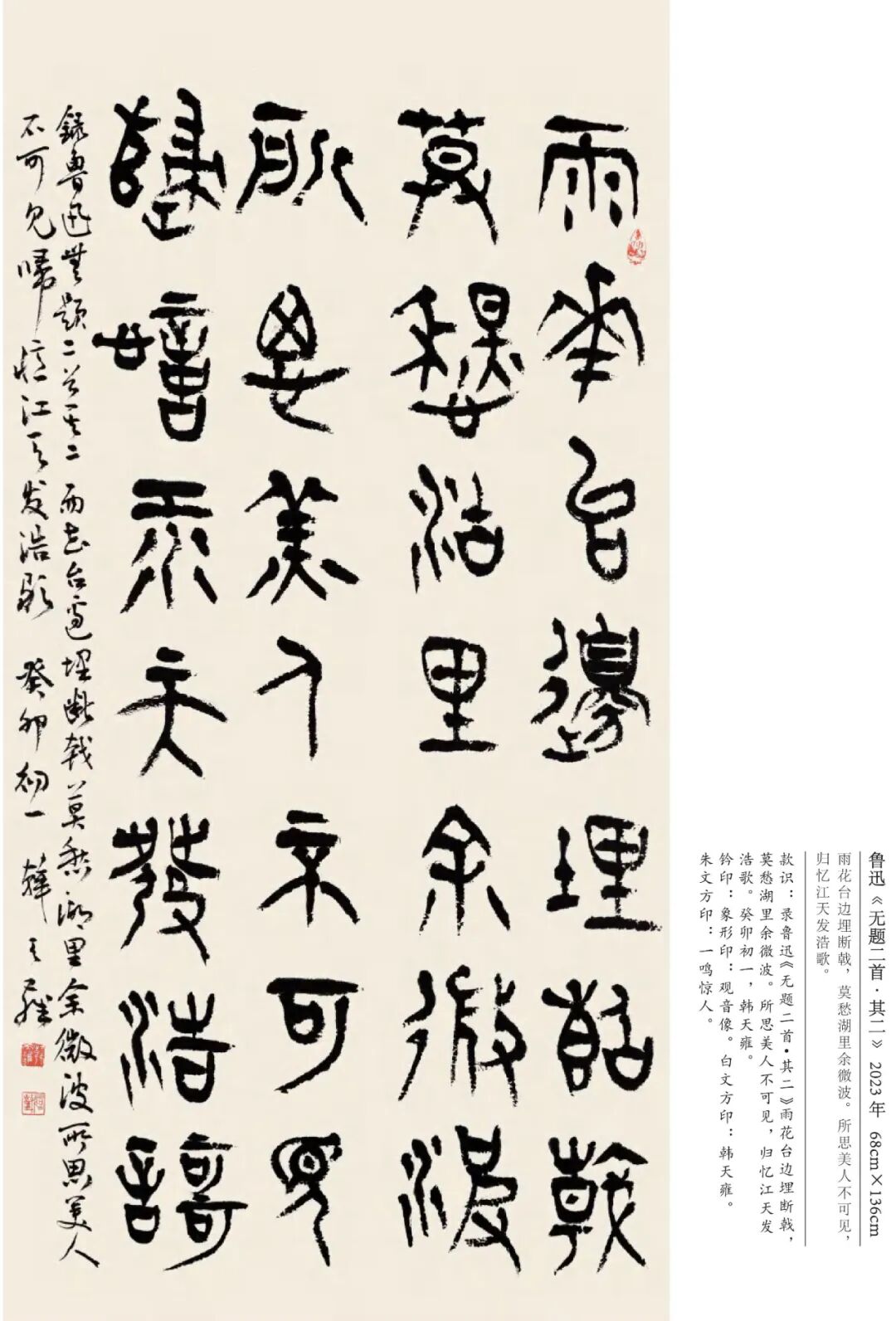 韩天雍 辽宁沈阳人,中国美术学院中国画与书法艺术学院教授、博士生导师。1984年获辽宁大学外国语言文学学士,1992年获浙江美术学院国画系文学硕士,师从沙孟海、刘江教授,2001年获首都师范大学中国书法研究院文学博士学位,师从欧阳中石教授。现为中国美术学院古文字书法创作研究中心主任、浙江省甲骨文学会会长、浙江省文史馆馆员丶教育部学位与研究生教育发展中心硕博学位论文通讯评审专家、上海美术学院特聘教授、博士研究生导师。日本岐阜女子大学特聘教授、中国书法家协会会员、西泠印社社员。1998年以来,应日本文部省邀请,赴日本岐阜女子大学及多所大学讲学十一年。著有《日本篆刻艺术》、《佛教写经》、《三笔三迹》、《中日禅宗墨迹研究》、《日本书道史》、《中国历代名家篆刻边款释文集成》《吴昌硕篆刻》、《韩天雍大篆》系列法帖十种。其中《中日禅宗墨迹研究》论著获国家“十一五”社会科学艺术基金奖。