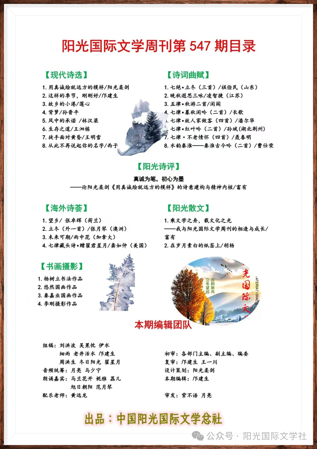 本期组稿:刘洪波 吴果忱 伊水 细雨 老井活水 邝建生 周洪生 冬日阳光 翟星月宣传推广:曹军亭 胥直春 徐丽琼 伊水 细雨 周洪生 老井活水 柳眉 冬日阳光 翟星月
