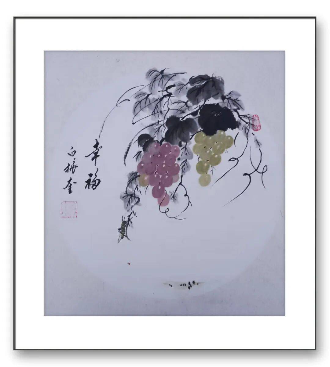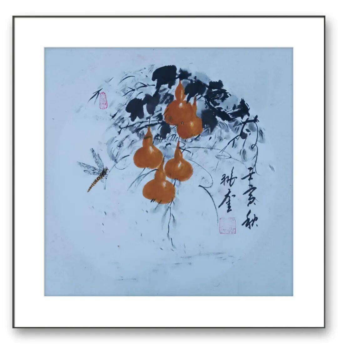 白振奎先生的葡萄图,以水墨晕染出葡萄藤的苍劲灵动,叶片的浓淡干湿层次分明,似在微风中摇曳生姿。那一串串葡萄,或紫若玛瑙,或绿似玉珠,颗颗饱满透亮,樱桃图则是另一番清新雅致。一篮红樱桃色泽温润,晕染得宜,仿佛能感受到果实的鲜嫩多汁;散落于旁的几颗樱桃,疏密有致,与篮中果实形成呼应,蓝釉果盘的淡墨轻描,更衬出樱桃的明艳。笔墨简约却意韵十足,把日常果蔬绘得如此动人,足见白老师对生活细微之美的敏锐捕捉与深情表达。再看葫芦图,墨叶如泼,恣肆豪放,葫芦的橙黄鲜亮夺目,形神兼备,一只蜻蜓翩然飞至,为画面增添了灵动生气。