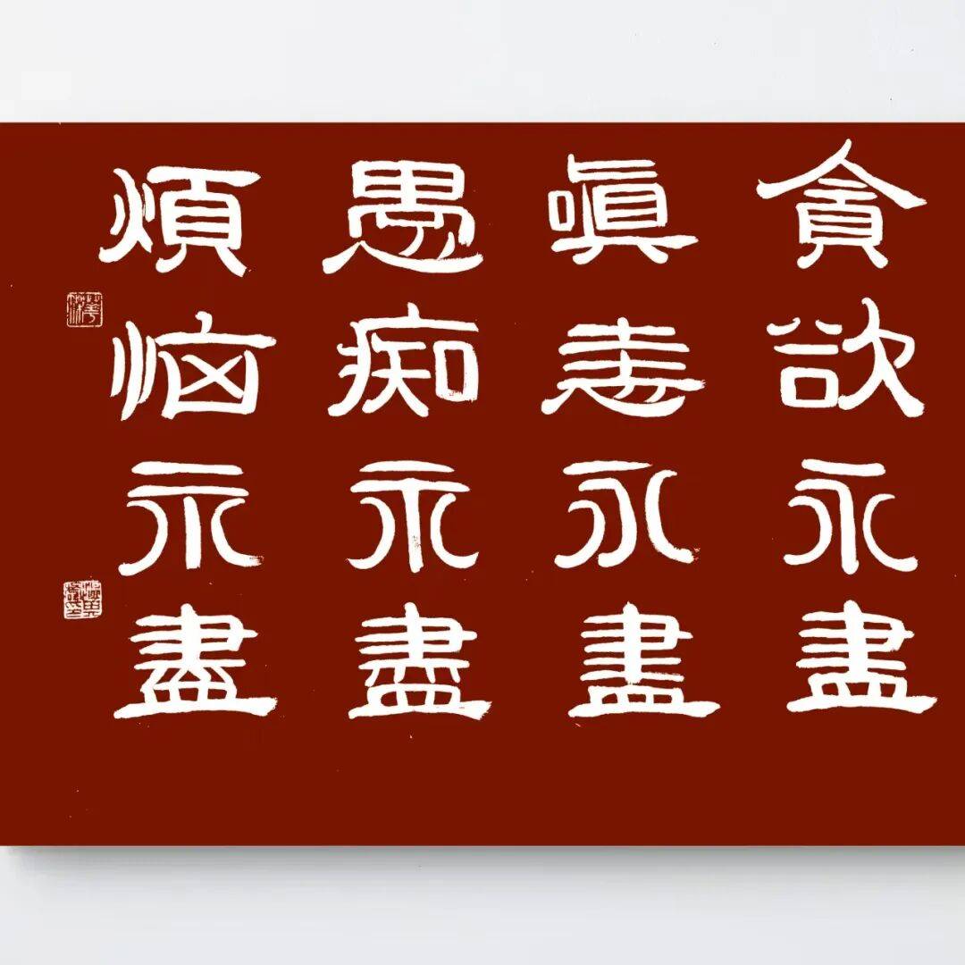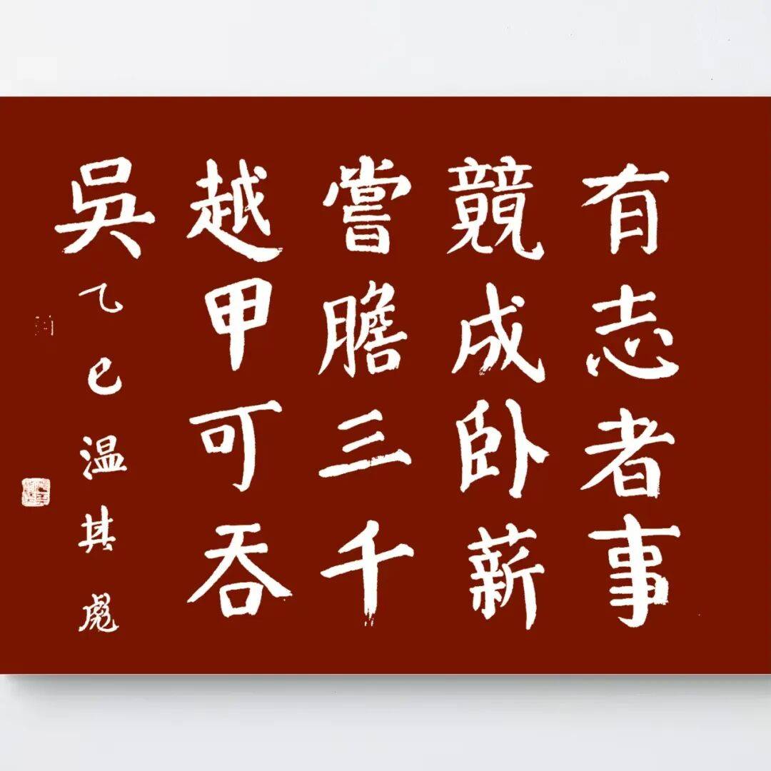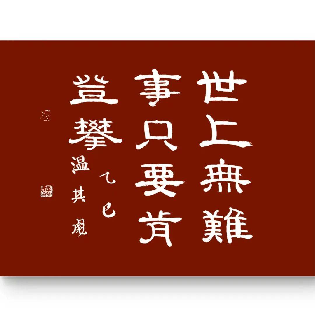 在点画处理上,温其彪发展出了一套极具个人特色的表现方式。他笔下的点画"俯仰呼应如凤翔,横竖穿插成橼梁,提按顿挫、一波二鮁幛雁軤靶所裟和孌源是功力十乘“,每一笔都蕴含着丰富的动作和变化。尤为难得的是,他“保留蚕头雁尾的基本视感,再添重浊轻清参差错落的新谋,师古而化古,不拘一格成一派",在尊重传统法度的前提下,大胆创新,形成了独特的笔墨语言。细观其作品,"笔法起势灵活而不失于严谨,结笔彻于飞动而又不失于力度",起承转合间尽显大家风范。结构处理的创新是温其彪隶书的另一显著特点。他打破了传统隶书相对固定的结字模式,赋予每个字以独特的造型处理:"其隶书字体时而富于上挑之势,时而又富于偏平之形,实乃变化丰富,其妙尽然"。这种灵活多变的结构处理,使他的作品避免了程式化的弊端,呈现出勃勃生机。