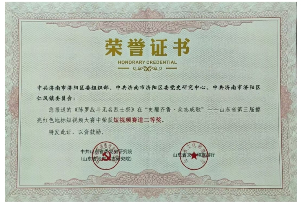 11月12日,由中共山东省委党史研究院(山东省地方史志研究院)、山东省文化和旅游厅、山东数字文化集团主办,中共枣庄市委党史研究院(枣庄市地方史志研究院)、中共枣庄市山亭区委承办的“史耀齐鲁·众志成歌——山东省第三届擦亮红色地标短视频大赛”优秀作品展播活动暨党史史志短视频创作推进会在枣庄市举行。济南市济阳区选报的《陈罗战斗无名烈士祭》《星火燎原-史家寺的黎明》两部作品,在全省第三届擦亮红色地标短视频大赛300多部作品中脱颖而出,荣获二等奖。