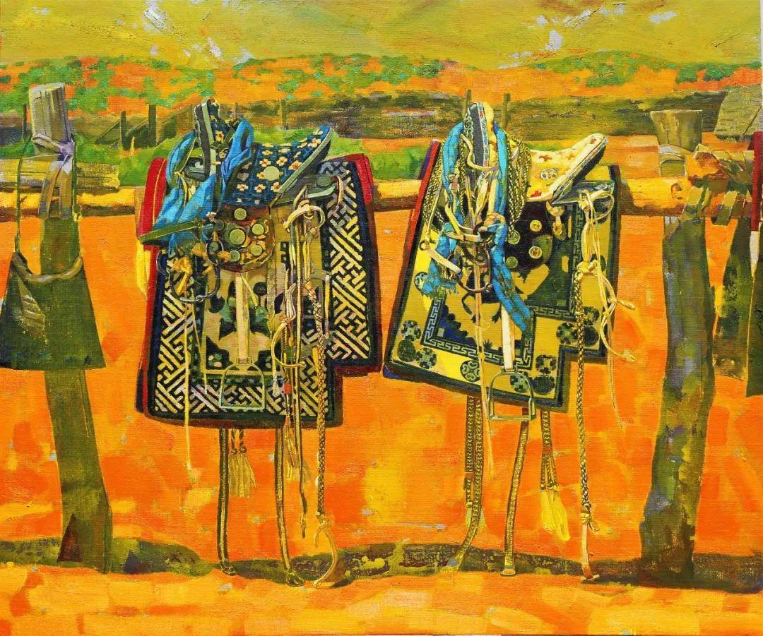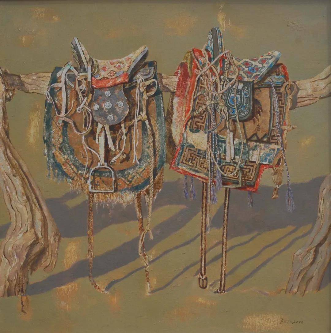 他的绘画形象表现的不单纯是视觉感官的隐喻,而是符号化地记述个人的心灵世界。他从马鞍这种符号中找到了适合自己趣味的表现方式,并试图把整个游牧文化精神浓缩在这个符号里。我们在他的《故乡情》等一系列作品的笔触与轮廓相重叠,平面化与立体空间的组合强烈地感受到真正属于他自己动态思考与想象空间。画家从日常用的马鞍表现了自己对游牧文明急剧变化的复杂感情,那种无奈的心理状态又使我们联想到现代文明之下游牧文明日渐边缘与式微。这正是画家灵魂的深处思考和精神世界的折射。