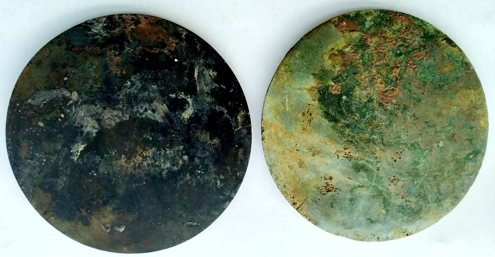 最令人称奇的是两镜迥异的锈蚀风貌,俨然诉说着南北地域的水土印记: