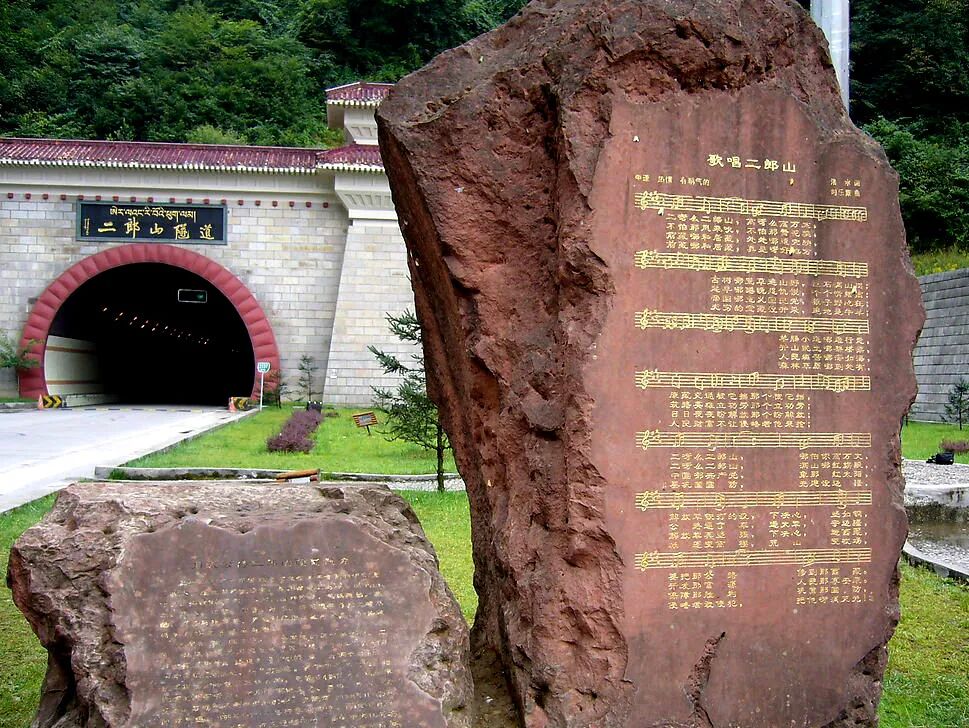 顺着二郎山入口新沟乡一直沿318公路直奔二郎山。雅康高速通车以后,318线就被冷落了,偶尔有稀疏的跑短途的车辆从这里经过。山路蜿蜒,车速缓慢,五十多公里路跑了一个多小时。终于見到二郎山隧道的洞口了!这个隧道长9176米,是当年全国隧道之最。海拨从4000多米降到了2800米,有了这条隧道,车辆再也不用在盘山公路上慢悠悠的行驶了,公路里程一下缩短了五十多公里。洞口外坝子耸立着一块铜牌,上面镌刻着《歌唱二郎山》。这首由洛水作词,时乐濛作曲的经典歌曲,唱响在上世纪五十年代初。歌词以修筑川藏公路为背景,歌颂解放军筑路英雄的艰苦奋斗不怕牺牲的奉献精神。歌曲获得一九五二年全军文艺创作奖。