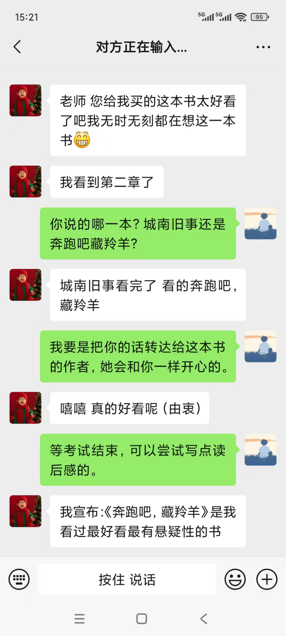 我的三哥是小学老师,他经常会买我的书给班里表现好的学生,或者送给家庭状况不太好的学生以鼓励和支持孩子读书,最近他常买的书就是《奔跑吧,藏羚羊!》,学生反馈:“无时无刻都在想这本书”,我想,故事的好玩、悬疑感可能是调动孩子胃口的原因。