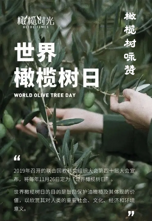 世界橄榄树日是由联合国教科文组织于2019年第四十届大会正式设立的,旨在彰显橄榄树在生态、文化、经济及和平象征方面的重要价值。该节日定于每年11月26日,以推动全球对橄榄树及其相关传统知识的保护与可持续利用。