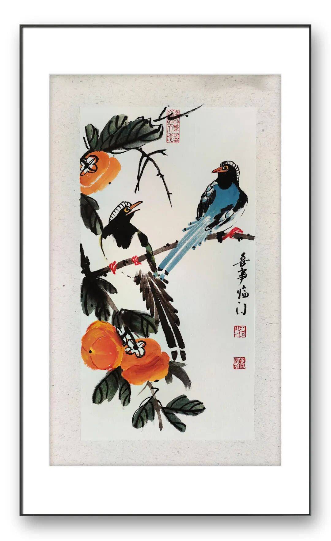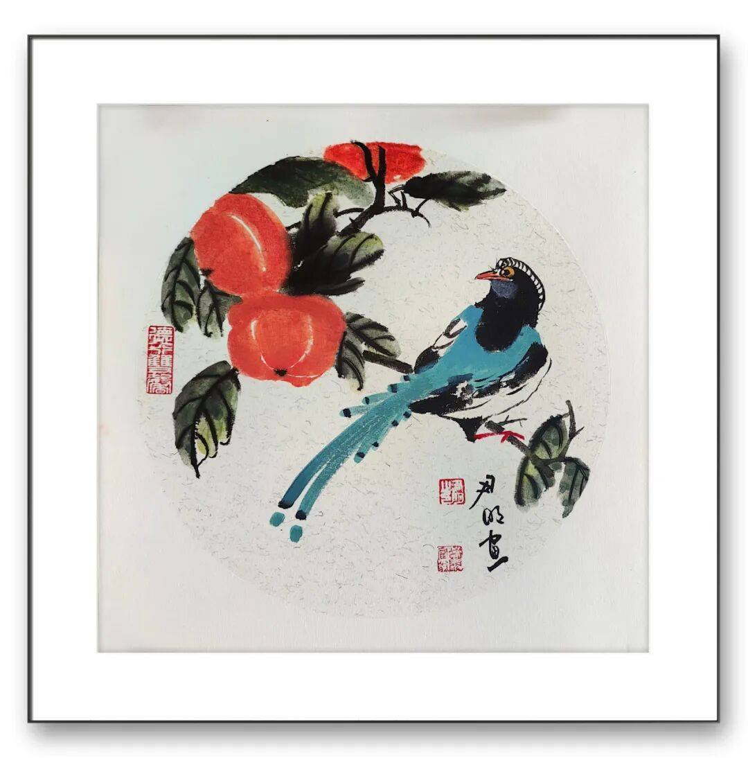 尹明老师以兼工带写之法,融色彩的明艳与笔墨的写意,既承文人画的空灵,又纳民俗的吉庆 —— 柿红是生活的红火,鹊鸣是心尖的欢喜,于尺幅间藏尽烟火与诗意,恰是中式美学 “以物寄情” 的生动写照。朱柿如灯,泼彩酣畅间晕染出秋熟的丰腴;蓝鹊羽色清润,长尾曳空如墨线流虹,寥寥数笔便将灵禽的机警与舒展凝于枝头。落款与朱印相映,留白处尽得 “事事如意” 的疏朗禅意。