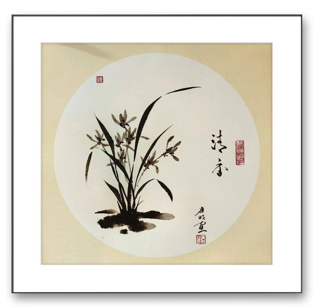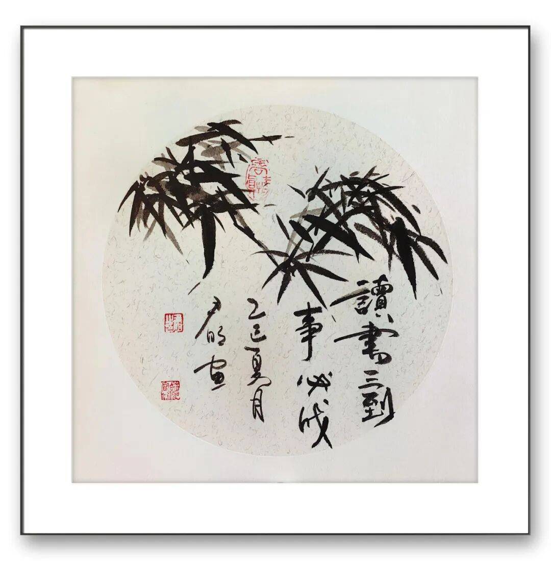 尹明老师的笔墨语言,是对文人画传统的创造性延续。观其兰草图,以水墨写兰叶,线条瘦劲如屈铁,一笔扫出的长叶既有郑板桥“冗繁削尽留清瘦”的骨力,又以墨色的浓淡枯润带出自然的摇曳之姿——起笔重按如兰叶之基,行笔轻提如临风舒展,收笔的飞白恰似叶尖的风露余痕,寥寥数笔便将兰草“空谷幽人”的气质托出。而在竹影清风中,竹竿以淡绿染出温润质感,竹叶则以浓淡相间的墨色点簇,既得吴昌硕“重、拙、大”的笔墨气度,又以灵动的晕染消解了厚重感,让竹的“劲节”与“清姿”达成了平衡。