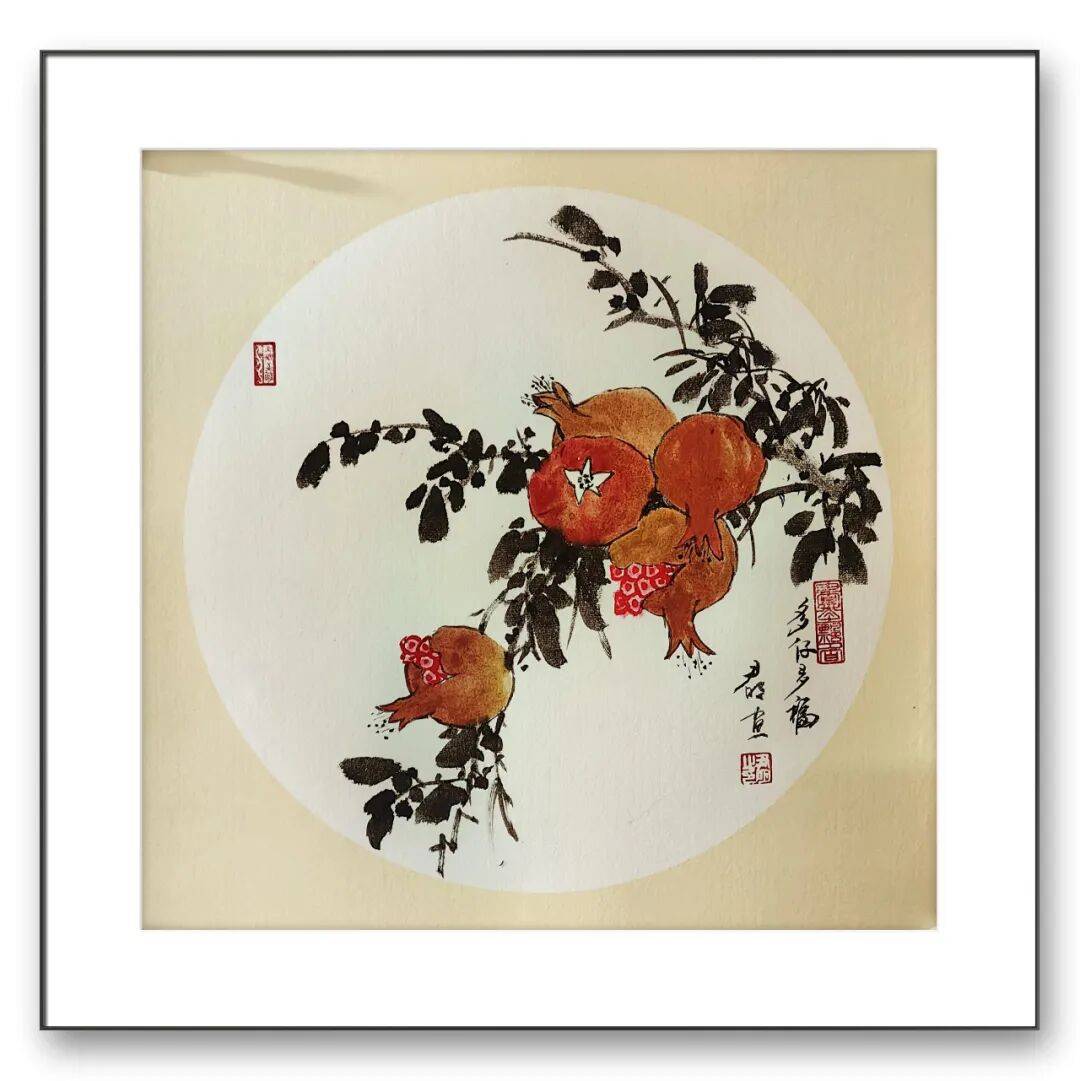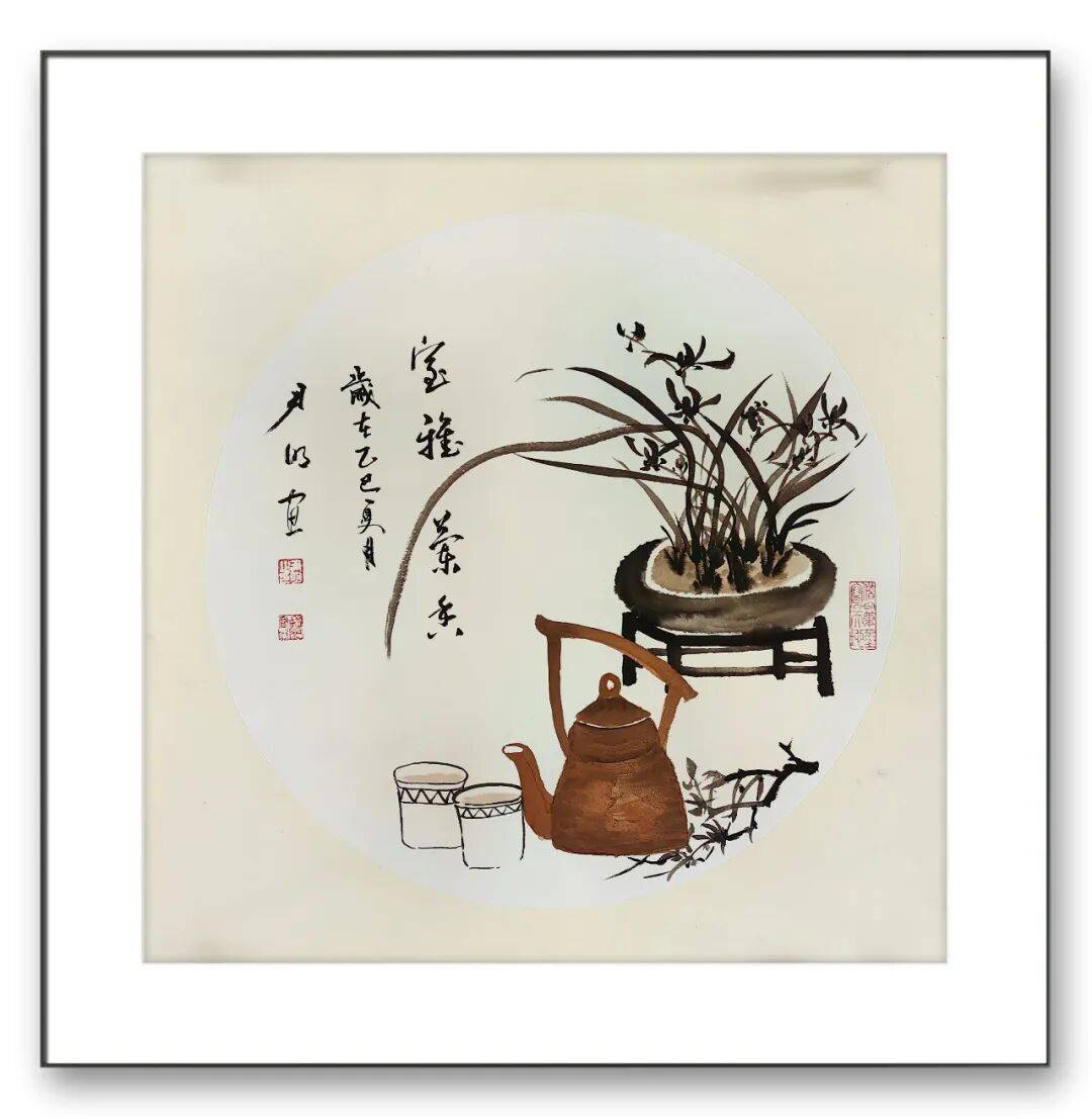 尹明老师的笔墨,是 “轻” 与 “重” 的平衡:画雀鸟用淡墨晕染,几笔便勾出蓬松的质感;写荷叶、兰叶却以浓墨立骨,线条见锋见韵。设色也克制,秋实的橙、荷花的红,都像从水墨里 “透” 出来的,不抢戏,却让画面活了。题款与钤印的排布更见巧思,或倚枝、或伴草,让方寸之间既有画意,又有文气。最动人的是这些作品里的 “温度”:不是远观的山水,是俯身可见的日常 —— 雀鸟的馋、夏荷的静、茶盏的暖,都藏着对生活的温柔凝视。