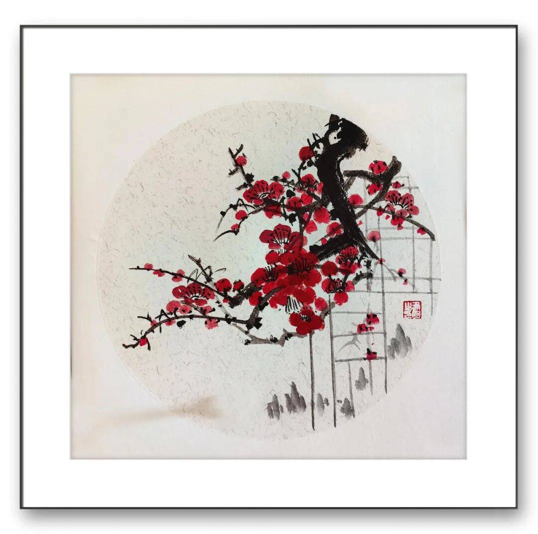 尹明老师的书画,朱砂点花浓艳却不媚俗,枝干以焦墨皴擦出苍劲之态,背景淡墨勾勒的窗棂,添了几分江南庭院的诗意,留白处的疏影横斜,暗承“疏影横斜水清浅” 的古典意境,却以明艳色彩跳出了传统墨梅的清冷,多了鲜活的烟火气。金黄葫芦与墨叶形成色彩反差,蝴蝶轻落的细节添了生趣,题款 “福禄呈祥” 直白点出吉祥寓意,却以写意笔墨消解了俗套,藤蔓的曲线如草书般流转,墨叶的泼洒见写意精神,让 “祈福” 的世俗意涵,裹在了文人画的笔墨审美里。无论是竹的风骨、梅的情韵,还是葫芦的吉意,都没有沉溺于复古的摹仿,而是以当代人的笔墨节奏,让传统题材长出了新的审美触角 ,既守得住文人画的精神内核,又接得住大众审美的情感共鸣,这正是这类小品最动人的地方:于尺幅之间,见笔墨,见性情,见生活。