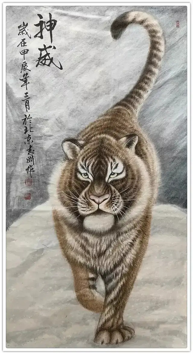 孙志刚的画作多次参加国际、国内书画大赛,先后数十次获得大奖,其中的奥妙就在于画家本身用笔用墨,气韵与意趣之妙,使她能始终坚持以灵性驾驭笔墨,在灵动、飘逸、率意、洒脱中体现出一种非常高雅的智慧。我对她的人品、画品总体评价是:“既有大海的品格,又有大海的禀性……”。画品即人品。孙志刚先生以绚丽而雅致的设色来烘托气氛,并紧紧把握动物之神形,用柔劲圆转的笔,稳健的线,深入刻画的五官、强调了四足的骨骼结构、须髯的疏密穿插笔笔到位,钢劲挺拔,以及皮毛斑纹的处理,显得细腻而洒脱。张口长啸,四肢配置,首尾造形,桀骜不驯的神态,正是一种王者之威的自然流露。