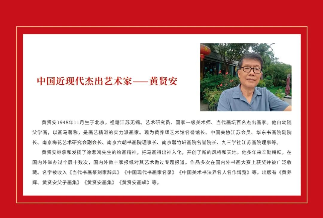 黄贤安 1948年11月生于北京,祖籍江苏无锡。艺术研究员、国家一级美术师、当代画坛百名杰出画家。他自幼随父学画,以画马著称,是画艺精湛的实力派画家。现为黄养辉艺术馆名誉馆长、中国美协江苏会员、华东书画院副院长、南京梅花艺术研究会副会长、南京六朝书画院理事长、南京馨竹轩画院名誉院长、九三学社江苏画院理事等。