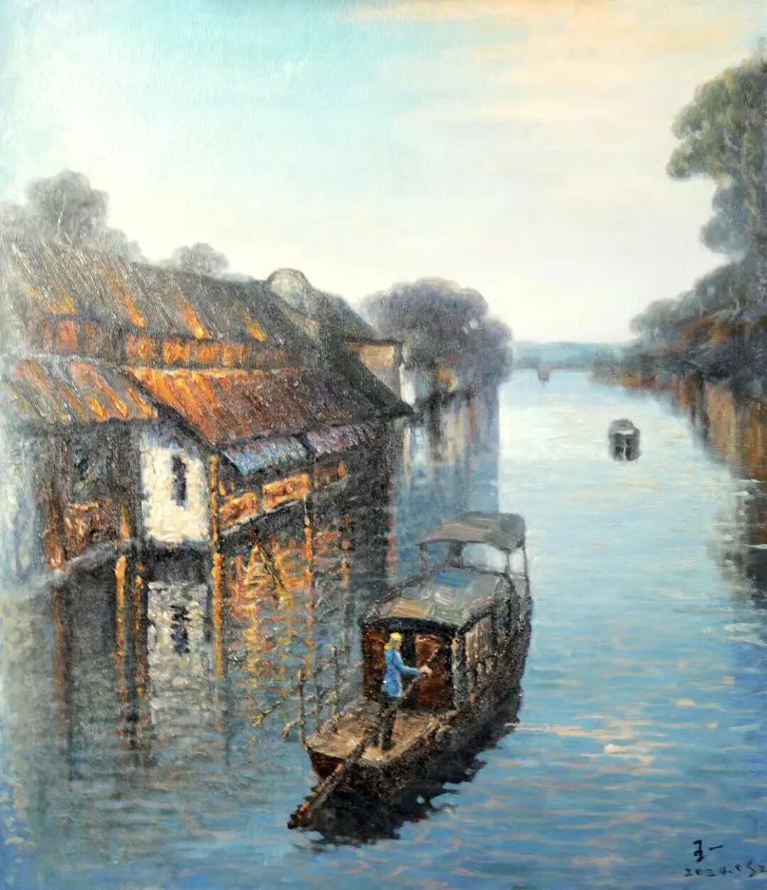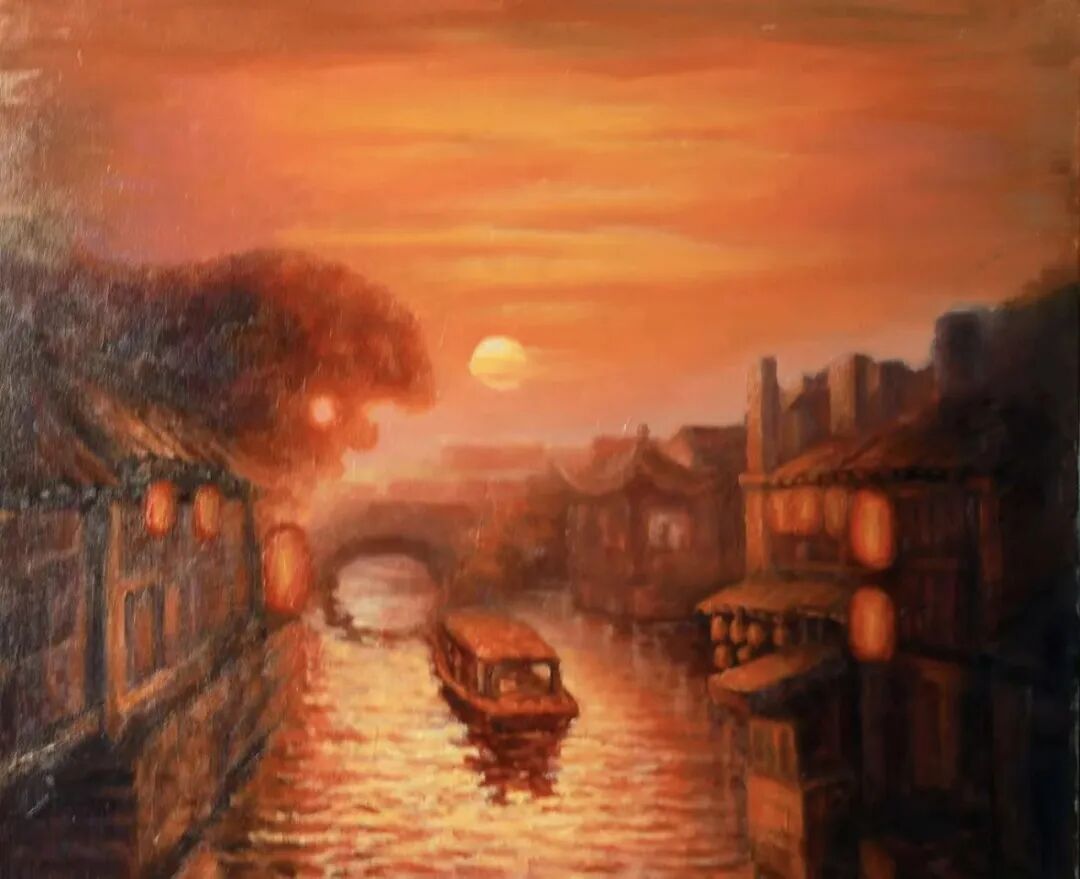 其画作被称作“新古典主义江南样本”,以西方写实框架承载东方美学内核。苏州画展中,《水乡之韵》系列引发关注——晨曦穿透薄雾洒向乌篷船,水面以短促油彩皴线模拟波光,观众惊叹“仿佛听见橹声搅碎晨霭”。