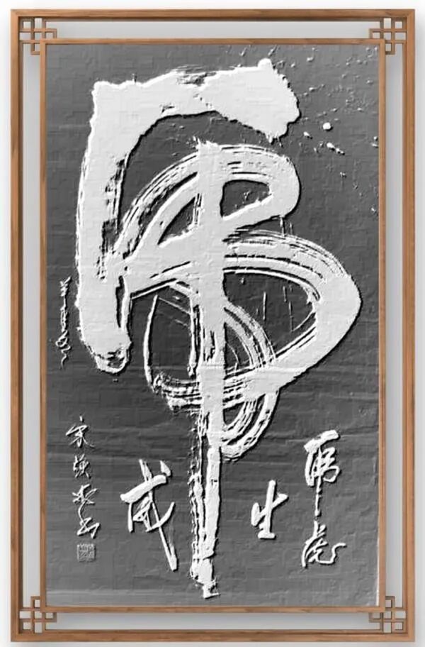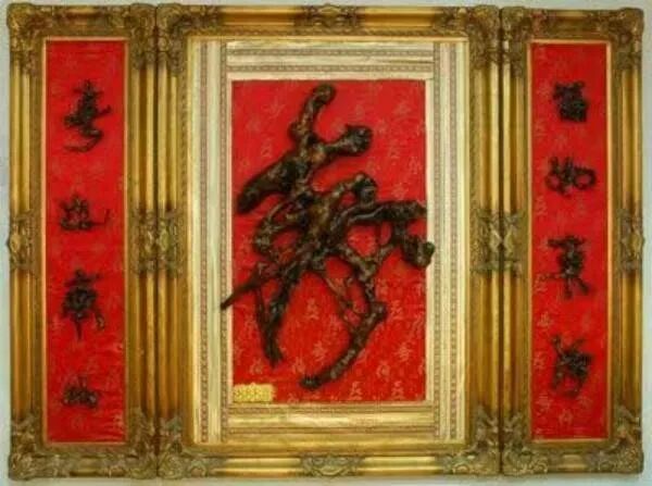 他创作的根雕字是纯天然珍稀浪木而成,巧妙利用大自然的杰作, 粗狂豪放,苍劲有力,有阳刚之神姿,字型美妙,逼真,意境高远, 完美体型,逼真造诣,鬼斧神工,妙艺天成,此乃是上天踢给的圣品, 是当今世上仅此无二,是大自然的杰作,化腐朽为神奇,它有苍天之仙气,地府之灵气,是辟邪、镇宅、永保平安、长寿的稀有珍品。香 港大公报及国内多家媒体称之国宝级根雕艺术品。是赠送达官显贵和成功人士绝佳礼品、是收藏家难得之物。适宜陈设在公司大堂,居家厅堂,是无价之宝。