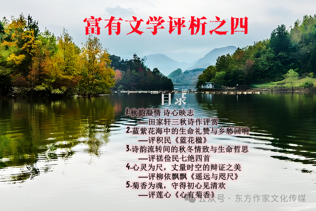 时序流转,文脉恒昌。当秋霜染透层林,冬雪初临大地,自然的荣枯交替不仅铺展成天地间的绝美画卷,更成为文人墨客寄情抒怀、叩问心灵的精神载体。本期“富有文学评析专题之四·秋韵凝情诗心映志”,特邀评论家富有先生执笔,以细腻笔触与深邃洞察,为读者解析五组佳作的艺术精髓与思想内核,在诗韵文香中搭建起一座连接自然景致与人文情怀的桥梁。