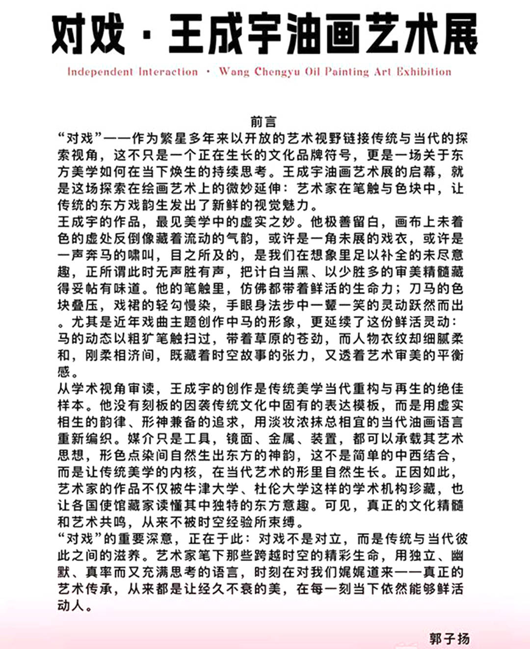 “对戏•王成宇油画艺术展”在繁星戏外艺术中心沉浸式启幕,本次展览出品人樊星,总策划任晓凡,策展人杨古院,学术主持郭子扬担任。
