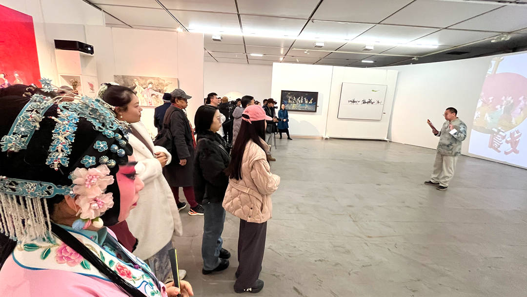 展览开场简洁有力,戏曲演员身着戏服登台,水袖翩跹、唱腔婉转,穿梭于油画作品间,与画作中的戏曲人物遥相呼应,带领观众一秒入戏,直观感受戏曲与绘画的跨界交融之美。