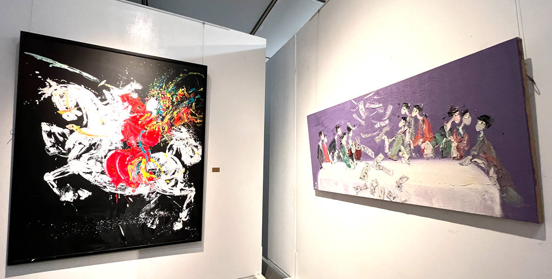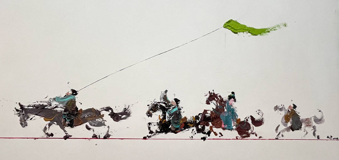 王成宇的笔触充满鲜活的生命力,刀马形象的色块叠压尽显苍劲,戏裙纹路的轻勾慢染饱含柔情,人物一颦一笑、手眼身法步皆灵动。尤其近年戏曲主题中的马元素,以粗犷笔触勾勒动态张力,搭配细腻衣纹,刚柔相济间既藏时空故事厚重感,又兼具审美平衡之美,完美融合戏曲神韵与油画表现力。