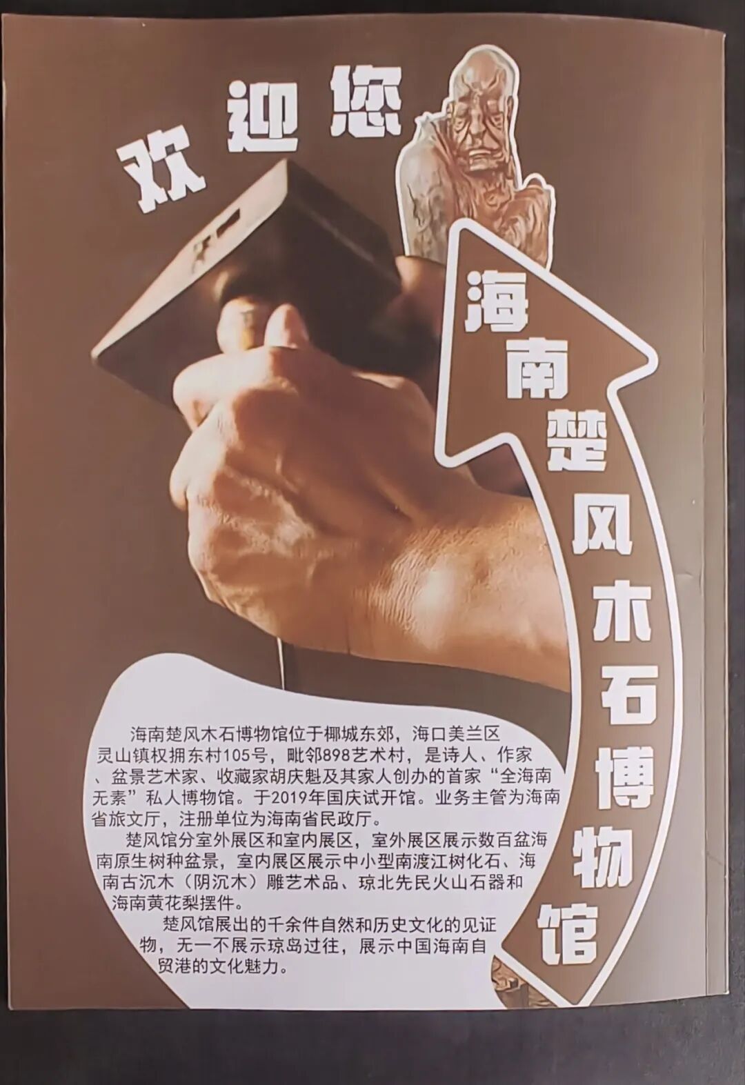 海南楚风木石博物馆位于椰城东郊,海口美兰区灵山镇权拥东村105号,毗邻898艺术村,是海南省纪委退休干部,作家、诗人、盆景艺术家、收藏家胡庆魁及其家人创办的首家“全海南无素”私人博物馆。于2019年国庆试开馆。业务主管为海南省旅文厅,注册单位为海南省民政厅。