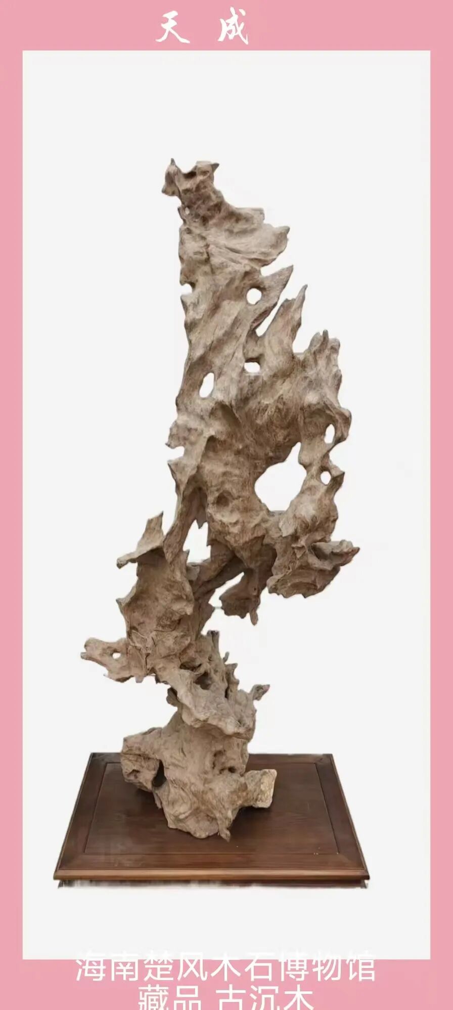 注:此海南黄花梨纯自然形态,未动一刀一斧,高130厘米,宽60厘米,重约50斤,有太湖石的皱透漏瘦,因而题名《太湖石韵》。