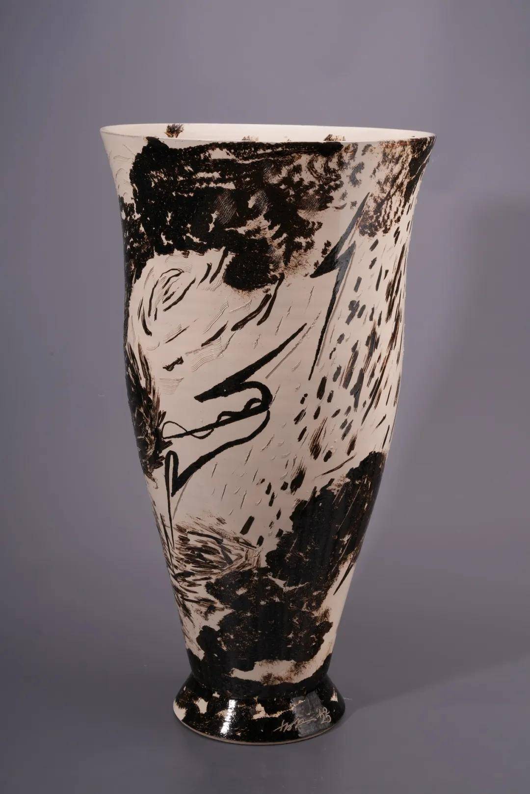 “有容”是器物最本源的含义,也构成了忻省江进入陶瓷艺术的起点。作为从平面绘画转入陶瓷领域的艺术家,他始终以容器的内部空间为观念核心,认为造型并非终点,反而是“空”的确立真正赋予器物生命。本次展出的作品,以旋转的器形为轴,结合他擅长的线性书写、黑白对比和节奏性的笔触,使绘画语言与器物体量形成同步展开的空间秩序。