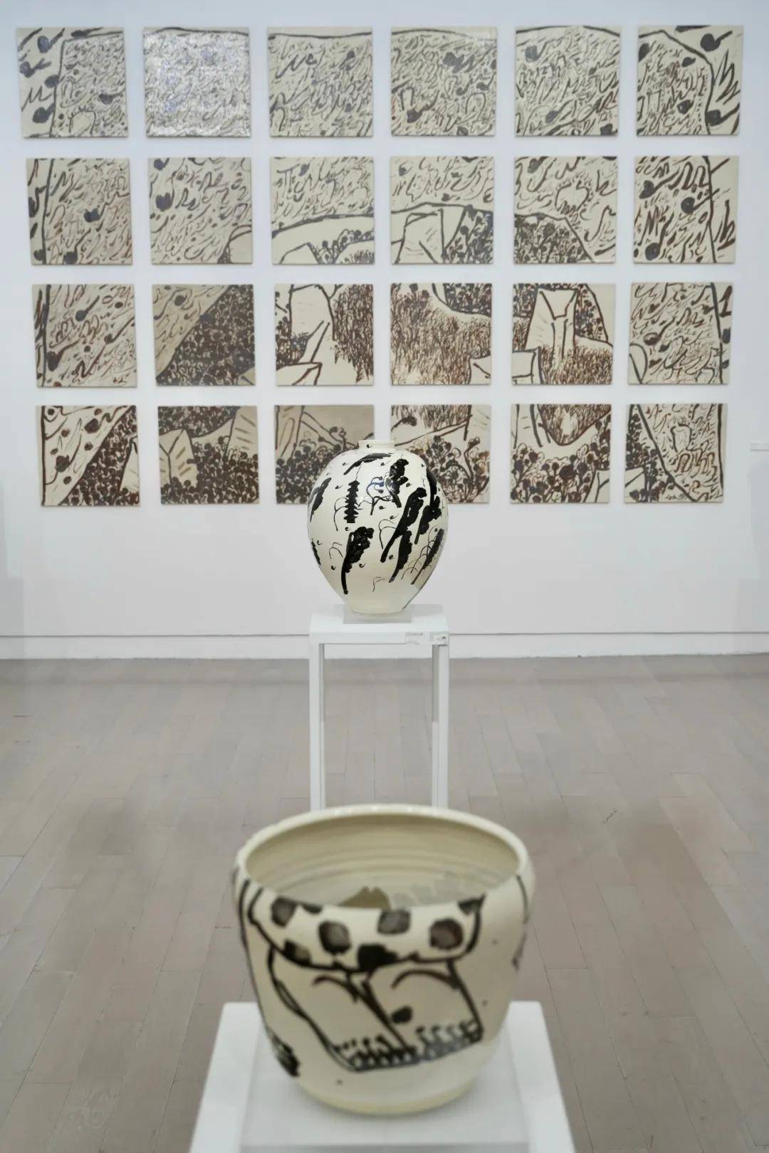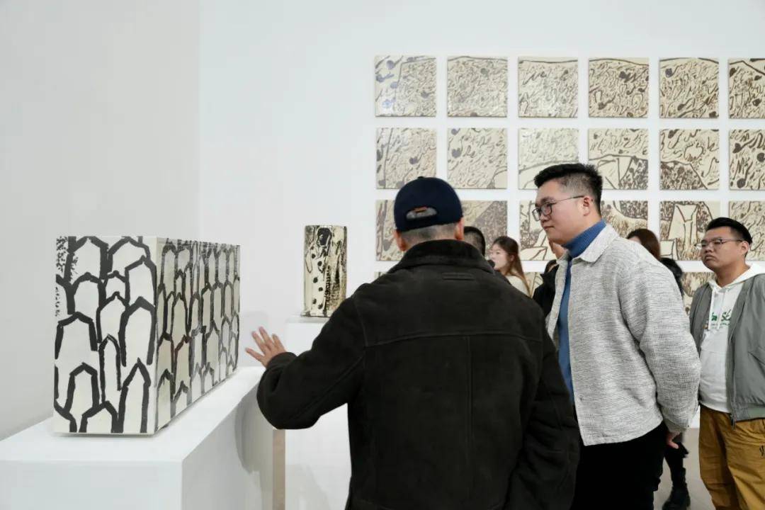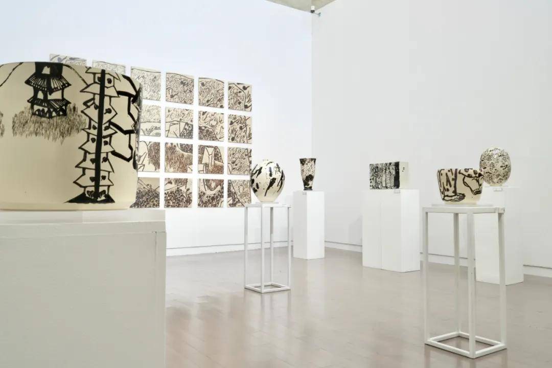 展览的另一条线索来自艺术家对云冈石窟的长期凝视。作为他的家乡古迹,云冈在他眼中不仅是宗教形象,更是由时间、风土与历史共同构成的“时光容器”。这种无始无终的空间经验,被转译为器壁上凝练、抽象的笔墨痕迹,使作品在陶瓷的旋转中呈现出一种缓慢流动的时间感。