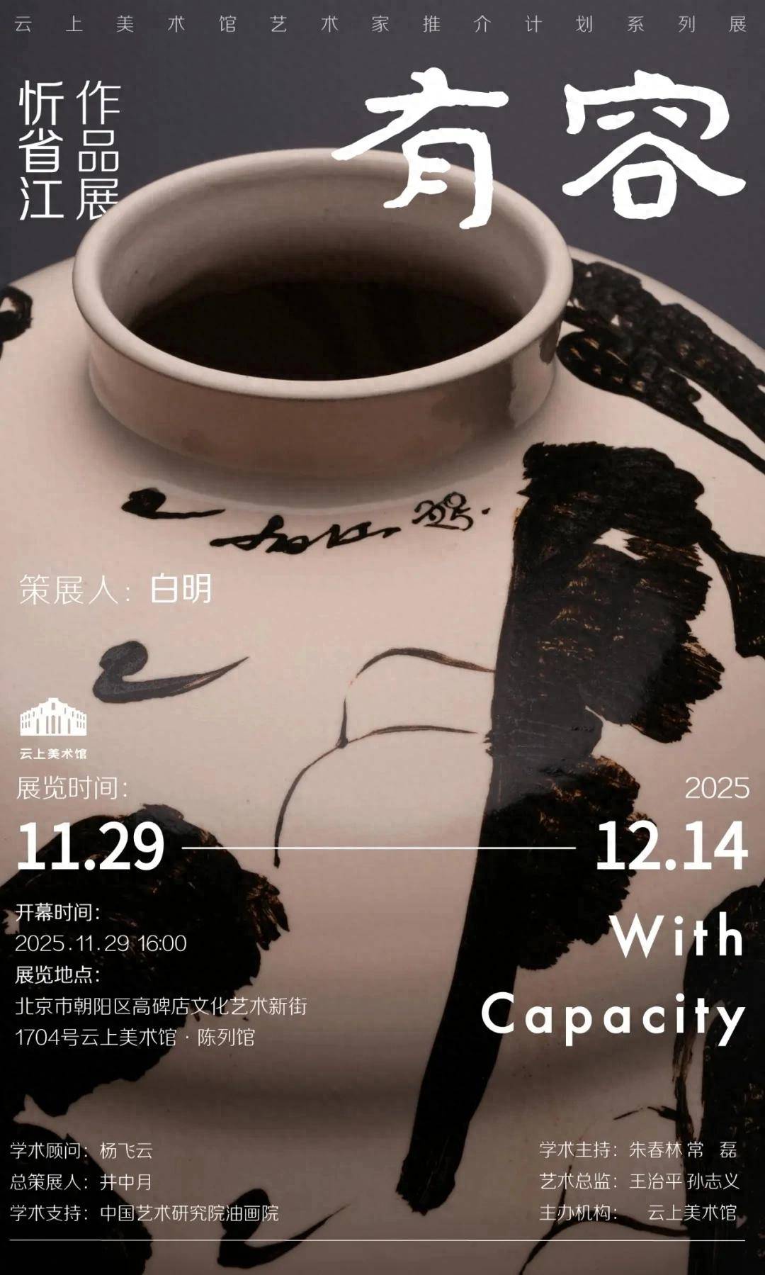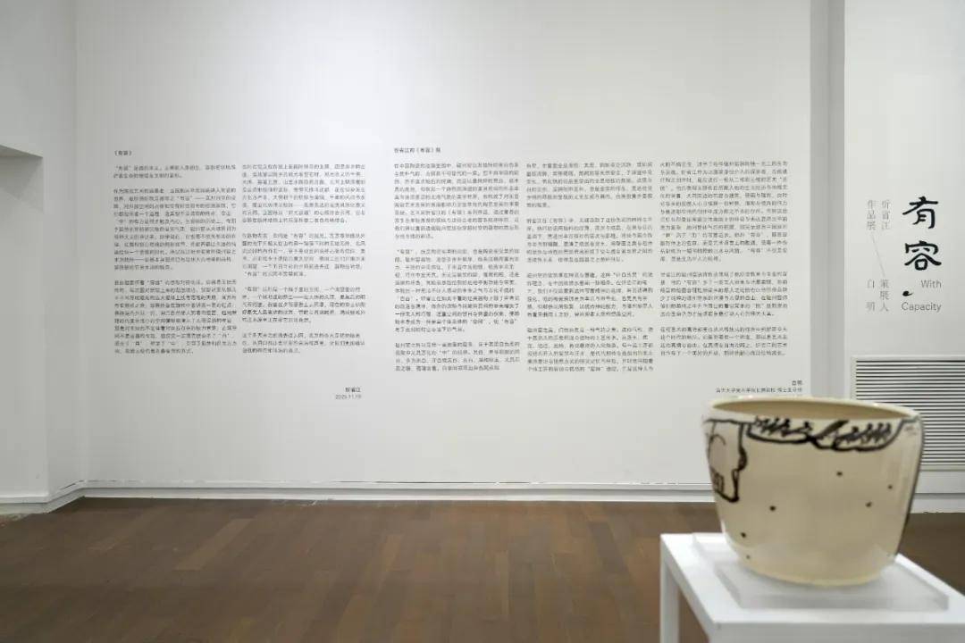 2025年11月29日,“有容——忻省江作品展”在中国艺术研究院油画院•云上美术馆开幕。本次展览属“自然•人化——云上美术馆艺术家推介计划系列展”,展览由云上美术馆主办,中国艺术研究院油画院提供学术支持。中国艺术研究院油画院名誉院长杨飞云担任学术顾问,中国艺术研究院油画院院长朱春林、副院长常磊担任学术主持,清华大学美术学院长聘教授、博士生导师、中国美术家协会陶瓷艺术委员会主任白明担任策展人,艺术批评家井中月担任总策展人。展览呈现十二件瓷器作品与一幅瓷板画,集中展示青年艺术家忻省江近年围绕“容器”展开的艺术思考与视觉结构。