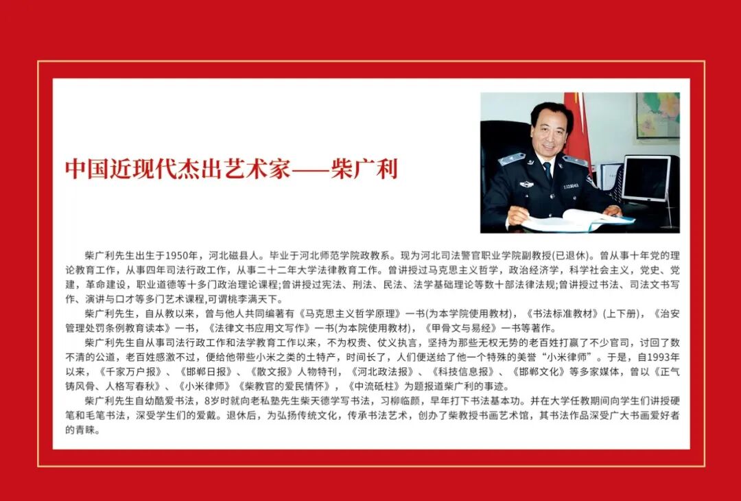 柴广利先生,出生于1950年,河北磁县人。毕业于河北师范学院政教系。现为河北司法警官职业学院副教授(已退休)。曾从事十年党的理论教育工作,从事四年司法行政工作,从事二十二年大学法律教育工作。曾讲授过马克思主义哲学,政治经济学,科学社会主义,党史、党建,革命建设,职业道德等十多门政治理论课程;曾讲授过宪法、刑法、民法、法学基础理论等数十部法律法规;曾讲授过书法、司法文书写作、演讲与口才等多门艺术课程,可谓桃李满天下。