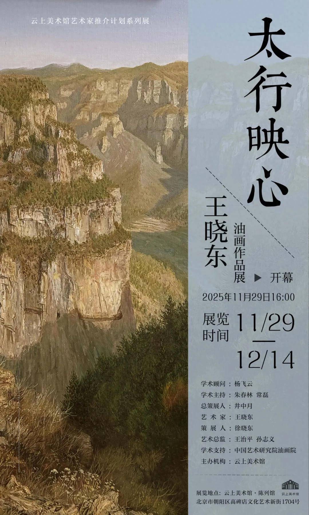 精华热点 2025年11月29日,“太行映心——王晓东油画作品展”在中国艺术研究院油画院•云上美术馆开幕。本次展览属“自然•人化——云上美术馆艺术家推介计划系列展”,展览由云上美术馆主办,中国艺术研究院油画院提供学术支持。中国艺术研究院油画院名誉院长杨飞云担任学术顾问,中国艺术研究院油画院院长朱春林、副院长常磊担任学术主持,中国艺术研究院油画院画家、博士生导师徐晓东担任策展人,艺术批评家井中月担任总策展人。
