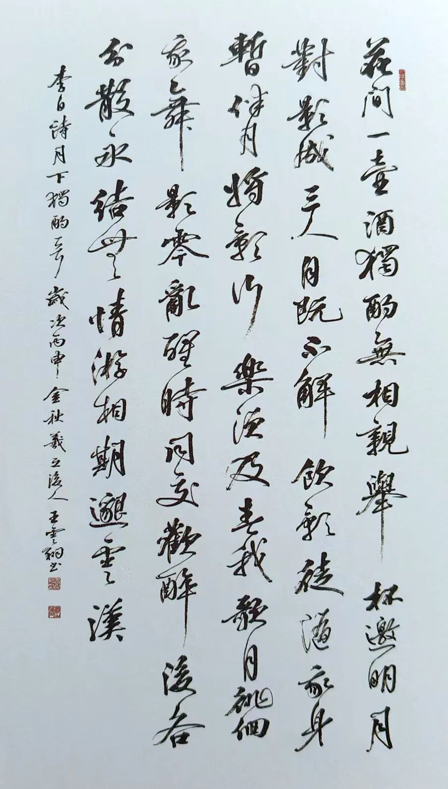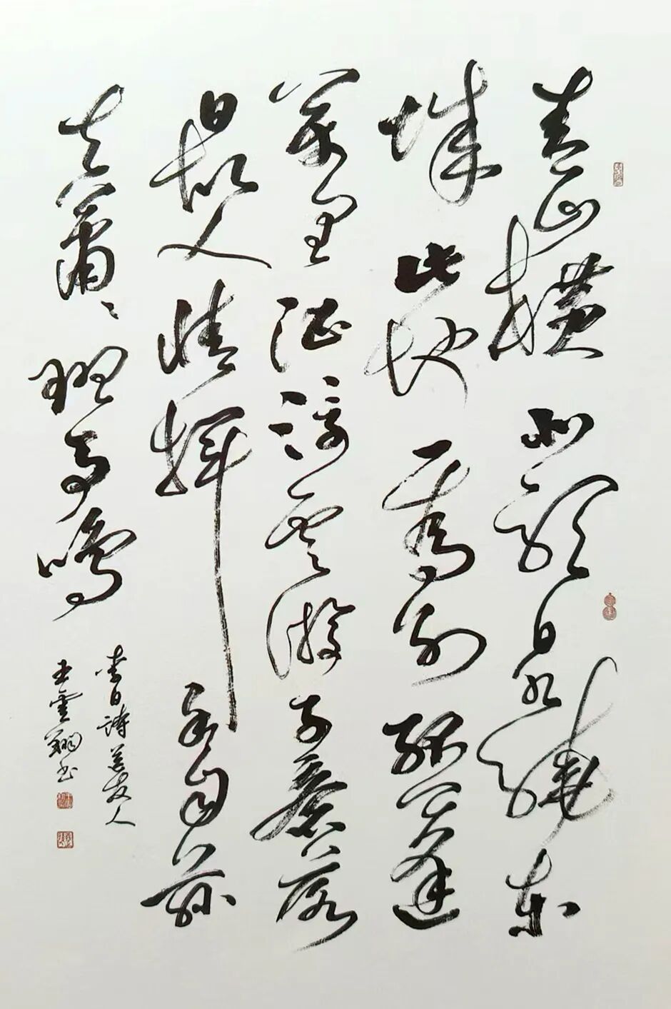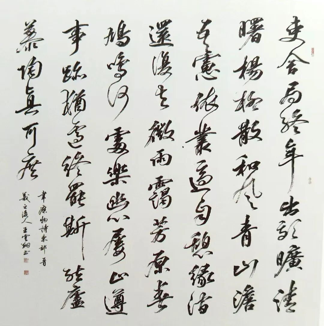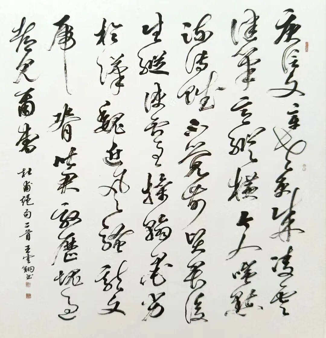 复观他的草书创作,线条塑造变化多端,有如虬龙盘曲腾跃于九天之上,时而似鸾凤展翅翩然于云霞之间。落笔皆如江河奔涌气势磅礴,却又在转折处暗藏细腻成为春风拂柳。节奏分明错落有致,起笔雷霆万钧,落笔似细雨轻吟。动静之间展现出惊人的生命力与艺术表现力。墨色浓淡变化宛如远山近水层次分明,笔势轻重缓急借鉴古琴曲的高低起伏,韵律悠长。飞舞的笔墨线条既驾驭传统书法的神韵,又重塑现代书法的审美特质,将千年的文脉与当代的精神熔铸于一炉。在他的笔下书法不再是简单的文字书写,成为视觉与心灵的盛宴,成为对天地万物诗意诠释。法度与灵动的完美统一,正是王云翔先生书法艺术的精髓所在。他的作品既有古帖的严谨厚重,又有今人的自由奔放,展现出艺术家高超的技艺与深厚的修养,是谓当代书法艺术的一道奇观!